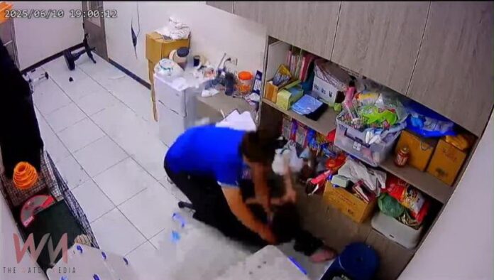 斗南鎮某寵物店傳恐怖男同事攻擊女同事事件,一名情緒管理失控的蘇姓男店員摔椅子發洩,然後再轉身撲身攻擊一旁嚇得動也不敢動的黃姓女同事。(圖/民眾提供)