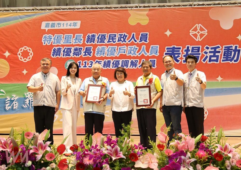 市政府表示,今天計表揚頂寮里蔡振盛里長與美源里羅鳳住里長等2位服務滿30年,獲得三等內政獎章的資深里長及10位特優里長、11位績優民政人員、3位績優戶政人員、1位資深鄰長、101位績優鄰長、113年35位獨任調解績優人員。另,東區民族里劉宗源里長榮獲嘉義市推薦,將代表本市前往內政部接受「特優里長」表揚。民政處科長陳惠珍、殯管所組員廖君育、東區區公所里幹事方愿國、西區區公所里幹事陳姿蓉、姚品如等5人也將代表本市至內政部接受績優民政人員表揚。