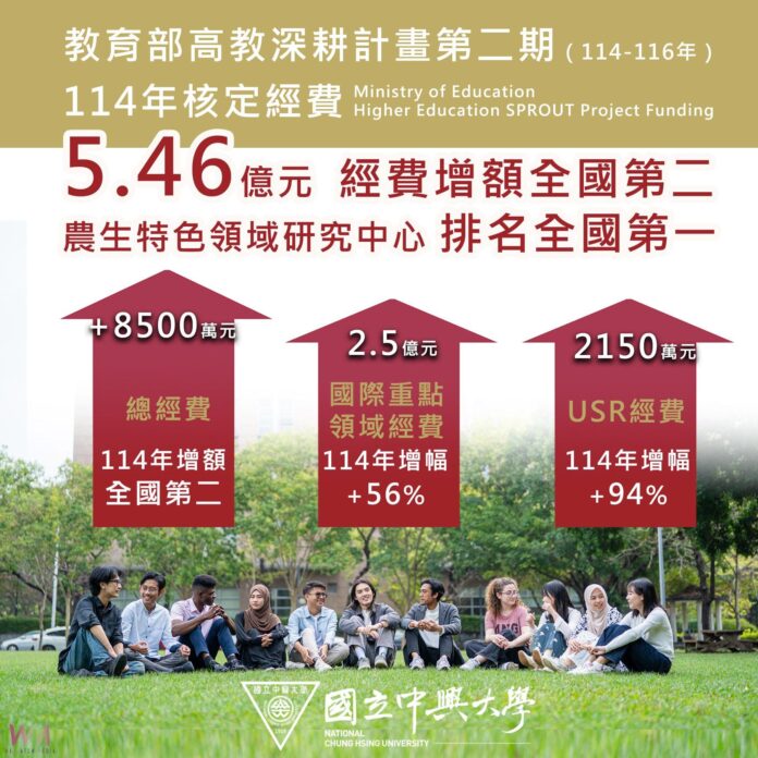 (觀傳媒中彰投新聞)【記者廖妙茜/台中報導】教育部於107年推動「高等教育深耕計畫」,幫助學校提升校務發展並提升國際競爭力,深耕計畫以5年為一期,目前已邁入第二期第二階段(114至116年)。教育部日前公布114年補助各大學經費,中興大學獲核定總經費來到5億46,50萬元,較113年增加逾8,500萬元,增額補助金額為全國第二高,與中山大學並列五億層級,僅次於台成清交;其中在國際重點領域面向,自1億6,000萬元提升至2億5,000萬元,成長56%,大學社會責任(USR)面向,自1,110萬元提升至2,150萬元,大幅成長94%,顯見中興大學執行高教深耕計畫成效深獲肯定。