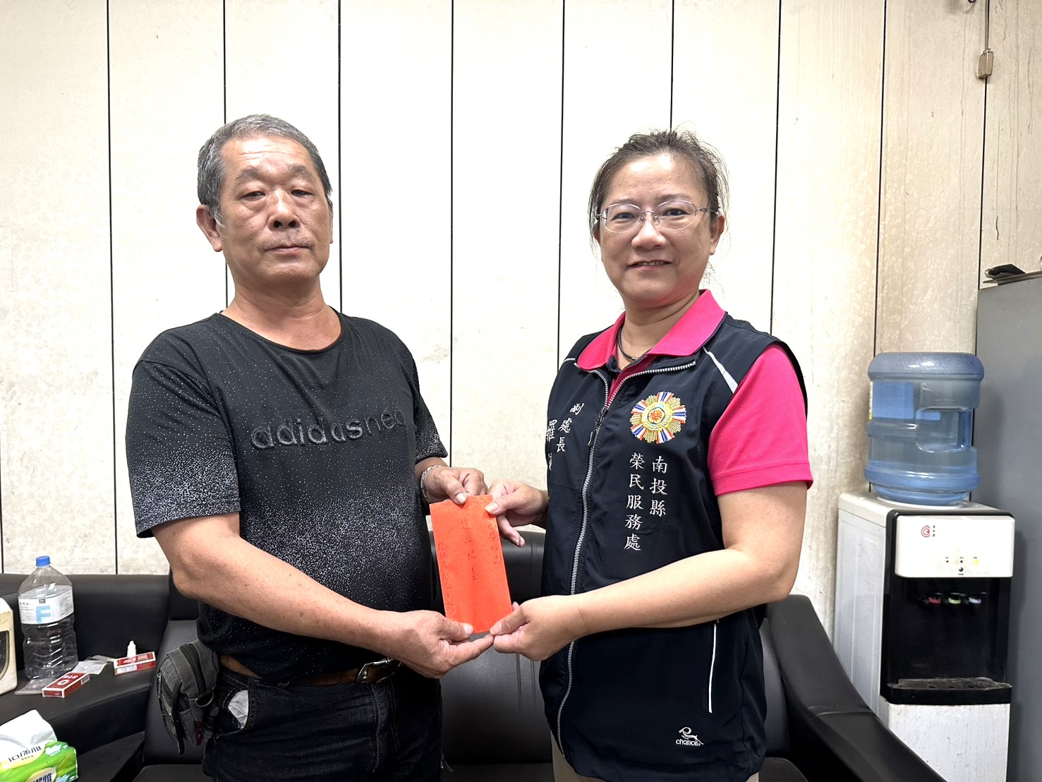 ▲竣旭公司董事長施賜東先生主動捐贈遺孤認養金,以實際行動關懷亡故榮民子女,副處長羅婷婷代表受贈。(圖/南投榮服處提供)