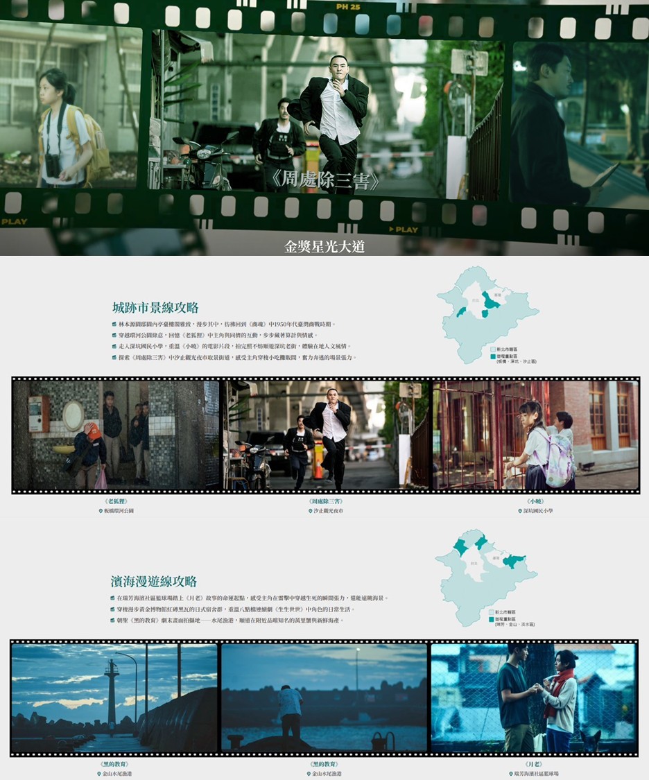 新聞局表示,此次推出的「金獎星光大道」分為「城跡市景」與「濱海漫遊」2條路線,「城跡市景」路線一路從實境節目《騎吧!哈林小隊》騎經的江子翠景觀河濱公園、再到於板橋環河公園搭景的電影《老狐狸》,以及電視劇《商魂》中深具時代感的林本源園邸,途經《小曉》校園拍攝地深坑國小、汐止白雲公園找尋《鬼才之道》拍攝場景,最後跟著《周處除三害》體驗汐止觀光夜市熱鬧的都市夜經濟;「濱海漫遊」路線則從電視劇《生生世世》中獨特的瑞芳黃金博物館四連棟日式宿舍建築出發,途經電影《月老》的經典場景瑞芳海濱社區籃球場、《黑的教育》的金山水尾漁港,最後一站是電視劇《天橋上的魔術師》取景地淡水六塊厝漁港。