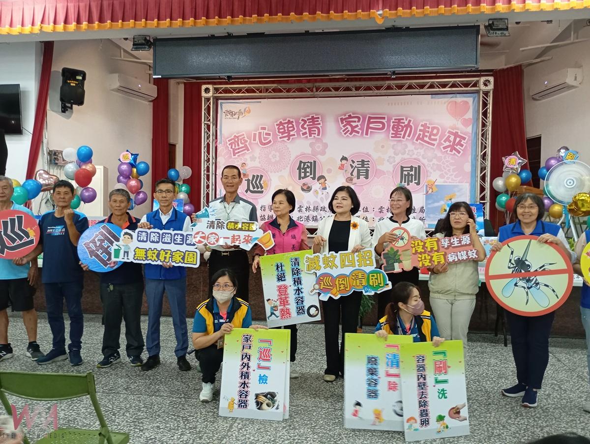 (觀傳媒雲嘉南新聞)【記者洪佳伶、蘇榮泉/雲林報導】雲林縣衛生局於今(24) 日在北港鎮老人會辦理「齊心孳清 家戶動起來」登革熱防治記者會,雲林縣縣長張麗善、副議長蔡咏锝、衛生福利部疾病管制署南區管制中心副主任陳紫君、副縣長謝淑亞、衛生局局長曾春美、北港鎮鎮長蕭美文、里長及民意代表均出席,號召鄉親一起攜手齊力來清除孳生源,並由縣長張麗善親自示範教導滅孑撇步「巡、倒、清、刷」,盼鄉親們共同啟動行動力,以消滅病媒蚊幼蟲(孑孓),防治登革熱。