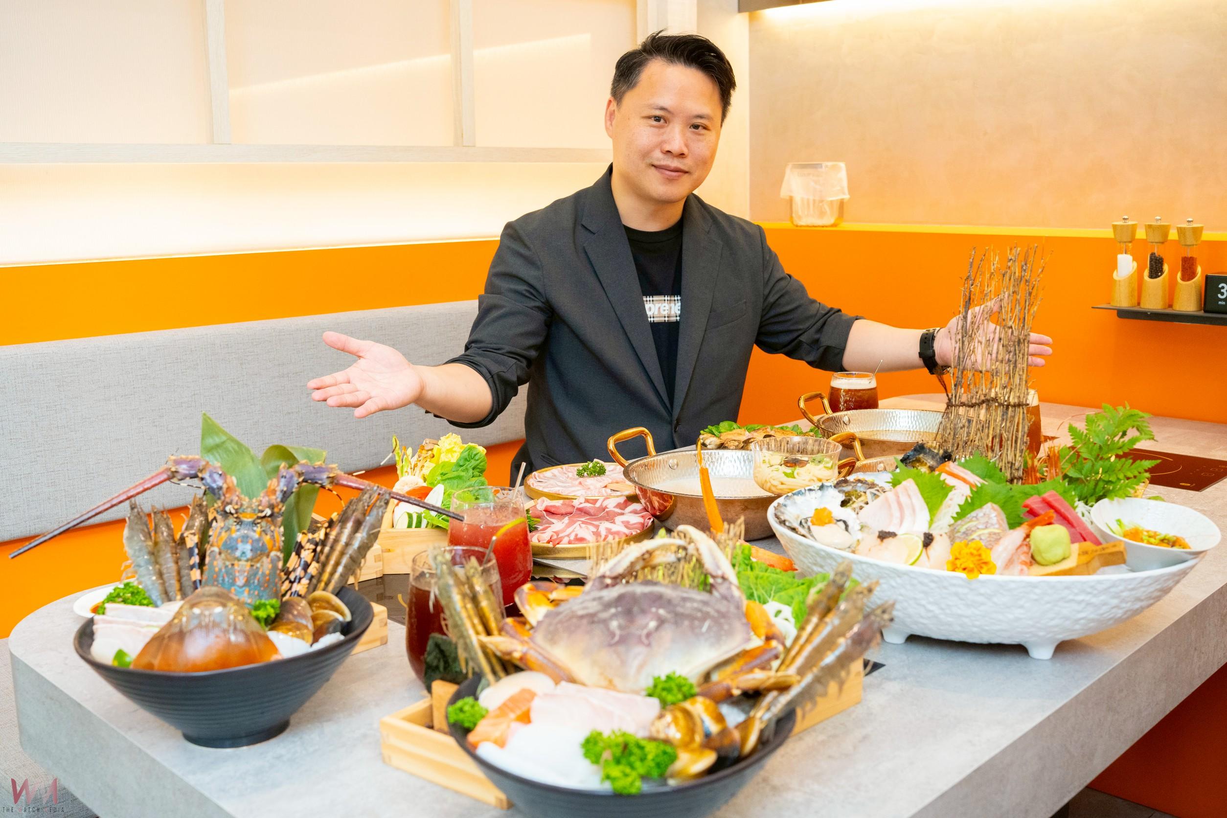 海港匠鍋|總經理賴彥群(中)與門市工作人員共同呈現「蟹旬味盛合」、「活體龍蝦盛和」與「極上綜合刺身拼盤」。(圖/記者廖妙茜拍攝)