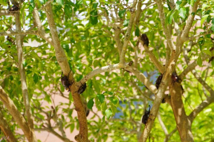 (觀傳媒彰化新聞)【記者陳雅芳/彰化報導】隨著盛夏悄然來臨,大葉大學校園迎來了一年一度的「獨角仙大爆發」奇觀,尤其在空中花園的光蠟樹上,成群結隊的獨角仙宛如「活生生的盔甲勇士」,展現牠們獨特的雄偉身姿與標誌性「彎曲獨角」,吸引眾多師生與生態攝影愛好者前來捕捉這難得一見的生態盛景。