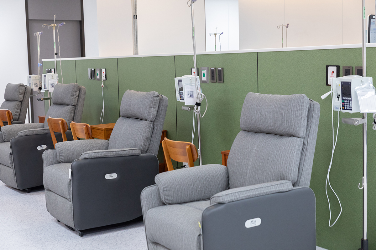 該中心內設有報到護理站、等候區、無障礙廁所、飲水機,並提供多樣化的治療空間與設備:包含注射椅、3間獨立單人套房、10張電動沙發床及7張油壓床,搭配防焰床簾,讓長時間輸液、化療或輸血的病人享有充足的隱私與舒適。每張床(椅)位皆配備氧氣孔、抽吸孔、照明、護理師呼叫鈴及USB充電插座,並貼心準備原木桌椅供陪伴者使用。針對免疫力較低的化療病人,床(椅)間隔至少1公尺,並採取左右分流、避免交錯入位的安排,確保感染控制。