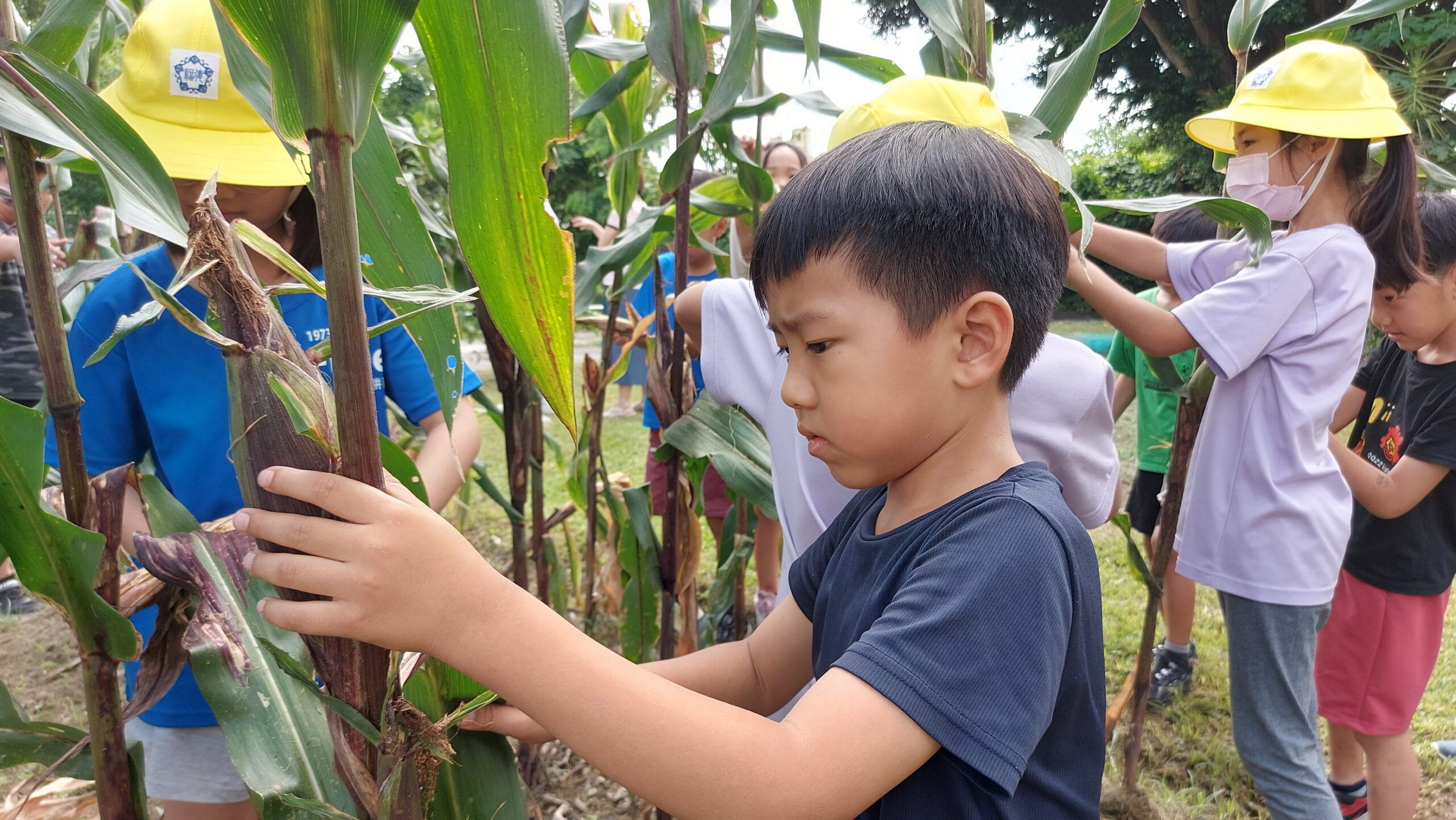 「這是我種的青椒,長得好大!」孩子們興奮地在農園裡穿梭,採摘青椒、茄子、玉米等當季蔬菜。這些作物是學期初孩子們在老師指導下與家長攜手種下的成果,不僅象徵親子合作,也讓孩子們理解從播種、照顧到收成的辛勞,強化食材珍惜與惜物惜福的觀念。