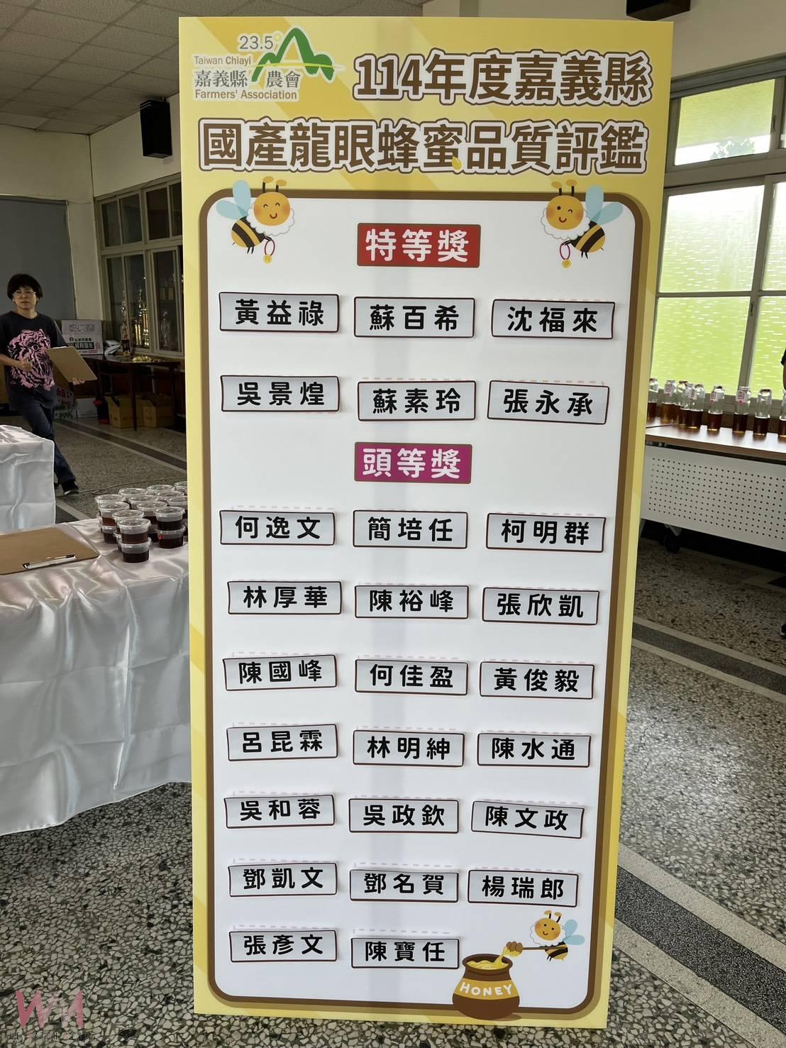 (觀傳媒嘉義新聞)【記者吳東林/嘉縣報導】嘉義縣農會為促進國產蜂蜜銷售及提昇品質,辦理114年「嘉義縣國產龍眼蜂蜜品質評鑑」,29組參賽蜂農全數通過第一階段初評,最後由黃益祿、蘇百希、沈福來、吳景煌、蘇素玲及張永承共6位蜂農奪得特等;何逸文等20位蜂農拿下頭等獎。