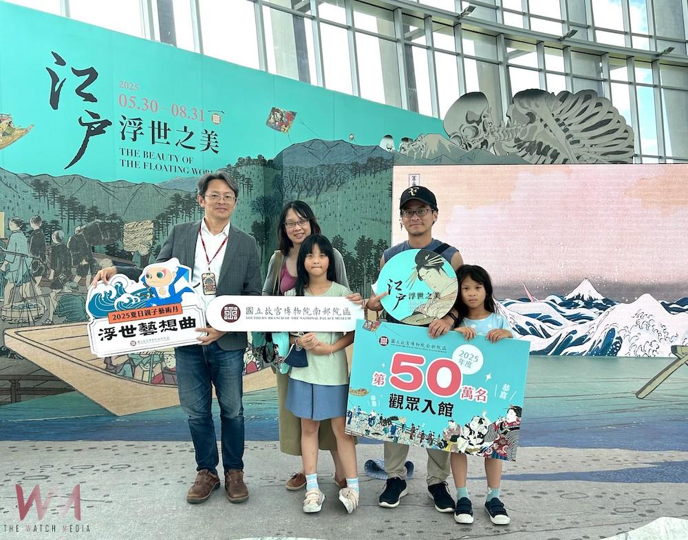 故宮百年南院開館第10週年,推出人氣國際大展「江戶浮世之美」特展,自開展後觀展熱潮不斷,又「2025夏日親子藝術月—浮世藝想曲」暑期活動今日上午開跑,下午已迎來第50萬名入館觀眾。現場由南院處處長彭子程代表歡迎,並致贈「江戶浮世之美」特展圖錄及紀念提袋給第50萬來自臺北淡水的親子家庭-盧先生、林小姐及兩位孩子。盧先生開心的表示,這是三天兩夜的嘉義之旅,特地安排第二天參觀故宮南院,起因於女兒閱讀小說《仙靈傳奇》而要求到南院來探詢神秘古物,沒想到幸運成為今年第50萬名入館觀眾,感到無比開心。
