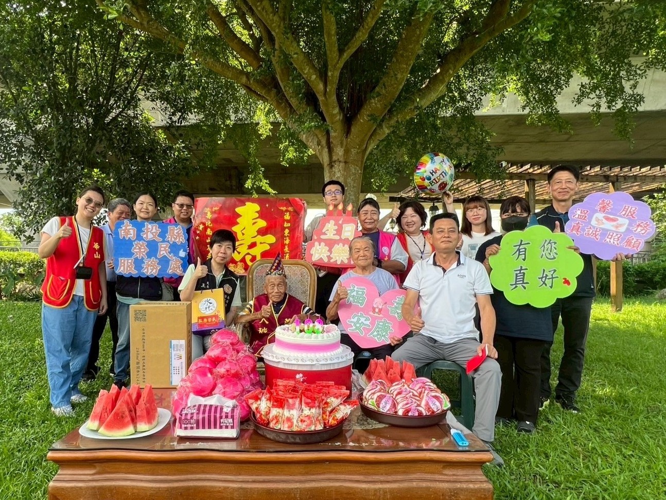 (觀傳媒中彰投新聞)【記者石振賢/南投報導】盛夏初始之際,喜迎名間鄉榮民蔡親金伯伯108歲壽辰,南投縣榮民服務處王怡文處長帶領同仁前往蔡伯伯家辦理慶生活動,並邀請華山基金會南投區社工及榮欣志工一同前往祝壽,王處長首先致贈營養補充品禮盒,並轉贈欣中天然氣公司賀壽禮券,華山基金會南投區社工也獻上賀禮。席間蔡伯伯將榮服處準備的壽桃分送與會來賓,現場洋溢歡樂的氣氛。眾人並歡唱生日快樂歌祝福福壽安康,讓蔡伯伯感受到榮服處的溫馨祝福與關懷。