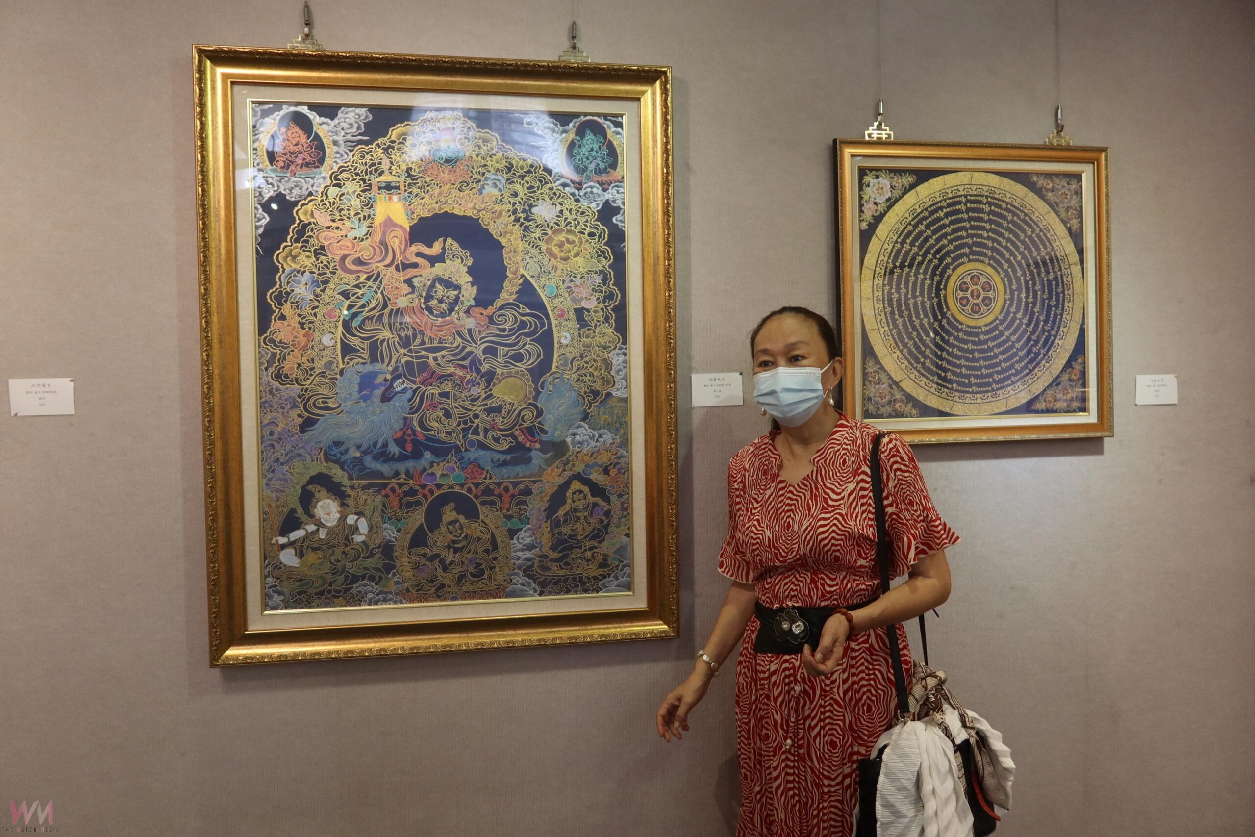葉心慈她特別提到,會員們從蓮花的構圖練習開始,象徵淨化與開悟,漸漸以工筆精細的筆法呈現諸佛菩薩自在慈顏,並將後現代工筆技法與傳統技藝結合,賦予作品新生命。