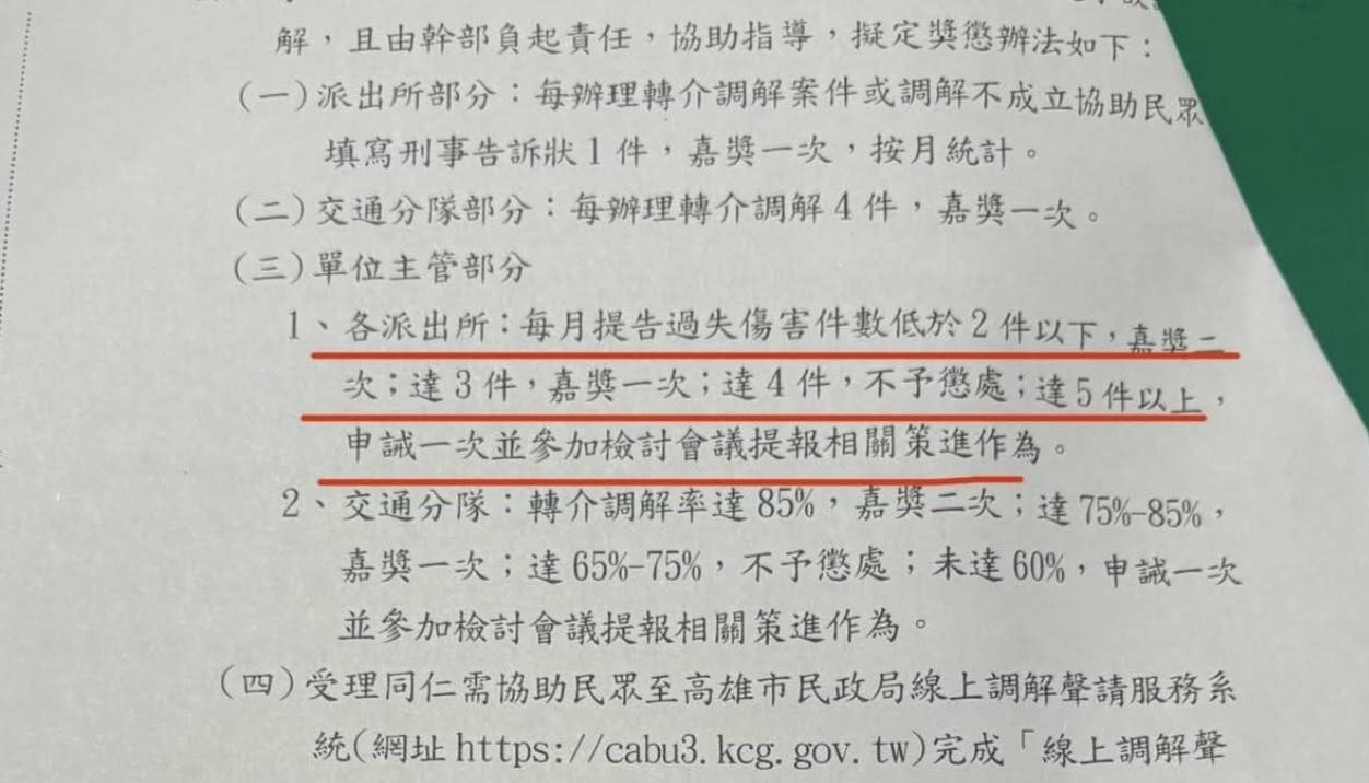 根據通報內容說明,各單位主管及派出所若每月提告過失傷害案件數低於2件,將嘉獎二次;達3件,嘉獎一次;達4件,不予懲處;超過5件則記申誡一次,並要求參加檢討會議提報改進措施。而交通分隊則以轉介調解率為基準,達85%嘉獎二次;75%-85%嘉獎一次;65%-75%不予懲處;未達60%則記申誡一次,並要求參加檢討會議提報改進方案。