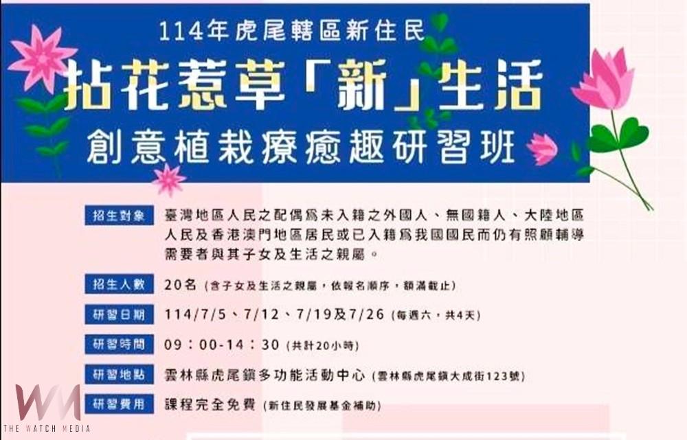 (觀傳媒雲林新聞)【記者蘇榮泉/雲林報導】為協助新住民朋友適應臺灣生活,增進生活技能與心理調適能力,雲林縣政府將於114年7月每週五上午9時至下午2時30分,在虎尾鎮多功能活動中心舉辦「拈花惹草『新』生活-創意植栽療癒趣」系列研習活動。全程免費並貼心提供臨時托育服務,讓新住民媽媽無後顧之憂安心學習。