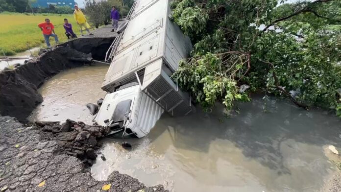 根據氣象局資料,彰化地區今日清晨起豪雨傾瀉,短時強降雨導致多處積水,二林鎮也進入一級淹水警戒區,上午約11時許,54歲陳姓男子駕駛大貨車,沿著二溪路七段2巷往南行駛時,路面突然塌陷,車身瞬間側傾陷入一處深達數米的天坑,現場濺起泥水,畫面驚悚。