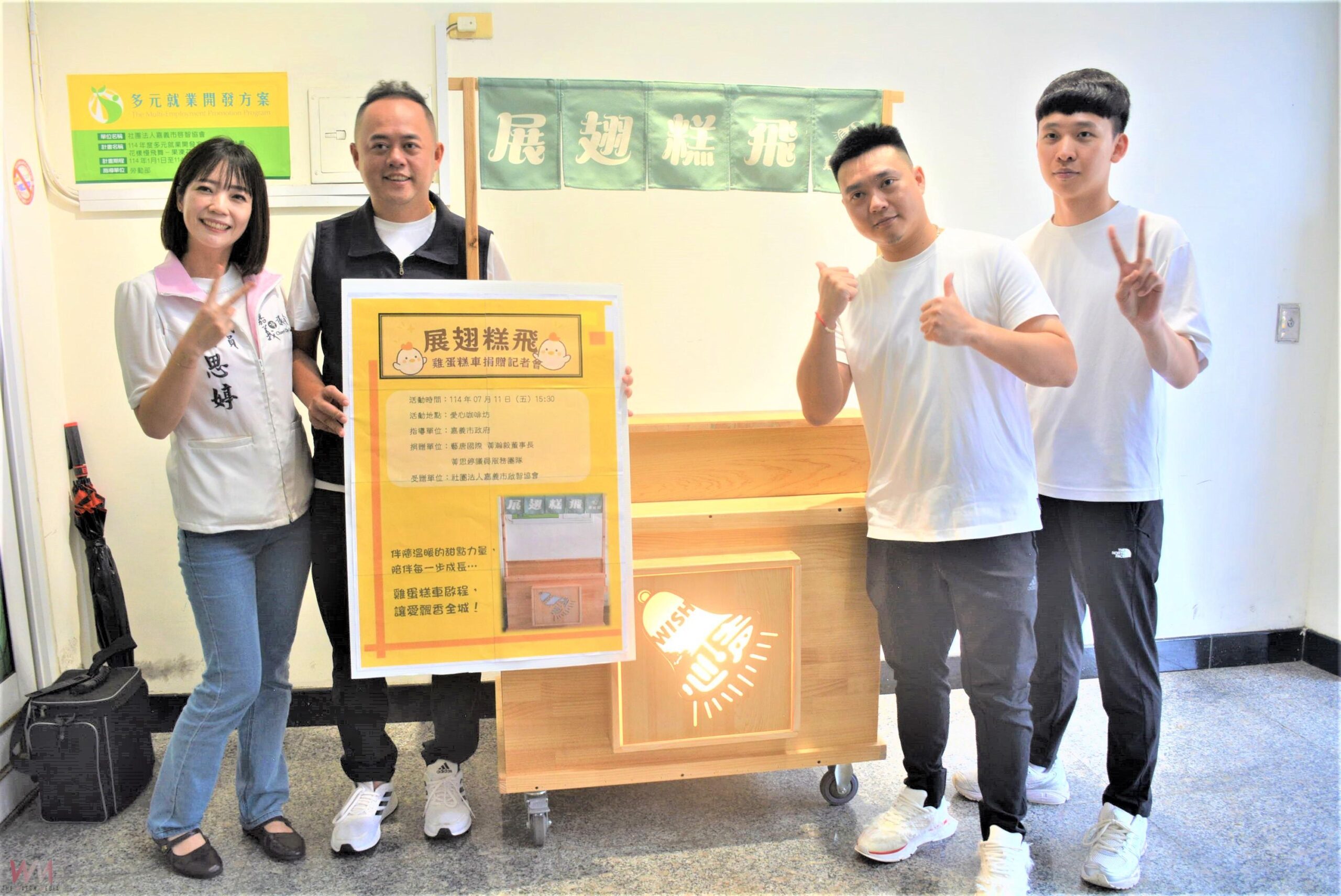 為了支持身心障礙團體,也為了讓身心障礙弱勢族群能有機會能學習新技能朝自立生活的目標邁進,長期關注社會公益的黃思婷議員,在聽到嘉義市啟智協會理事長李富順及總幹事蕭慧津闡述雞蛋糕車計畫後,立即結合藝唐國際黃瀚毅董事長,並在其慷慨解囊下,於7/11日捐助一部雞蛋糕攤車給嘉義市啟智協會,希冀藉由雞蛋糕攤車,讓心智障礙學員能拓展多元工作技能,突破弱勢群體的侷限,有蛻變成長的機會,也希望能拋磚引玉讓社會大眾能共同關注身心障礙團體,大家一同為社會貢獻心力。