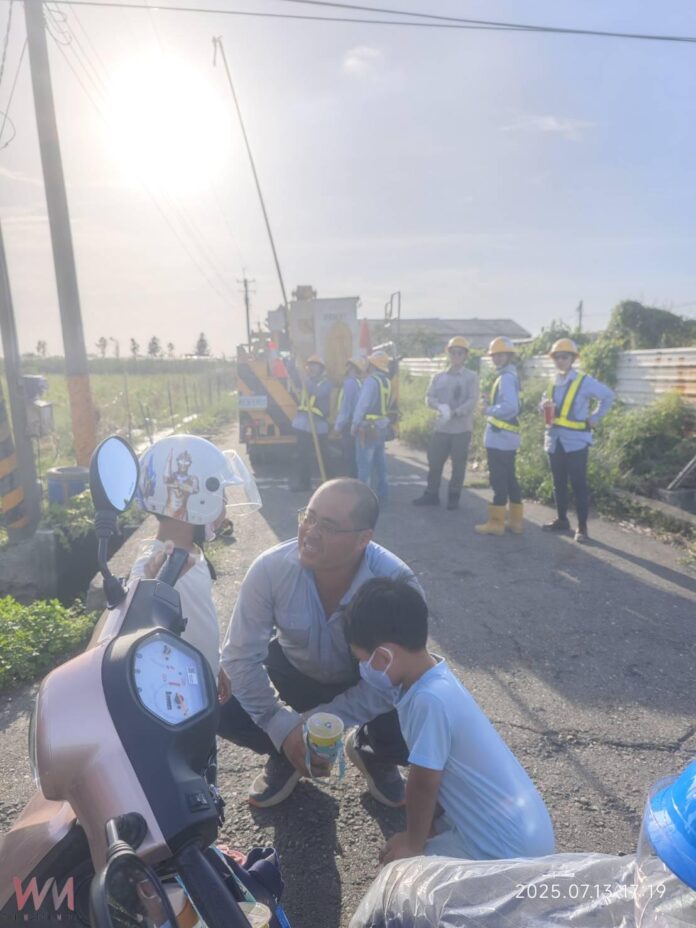 烈日下的鋼鐵英雄郭枝茂副班長,卸下疲憊,只為孩子露出的笑容,成為支撐台電人員度過漫長黑夜的溫柔力量。(圖/台電嘉義區處提供)