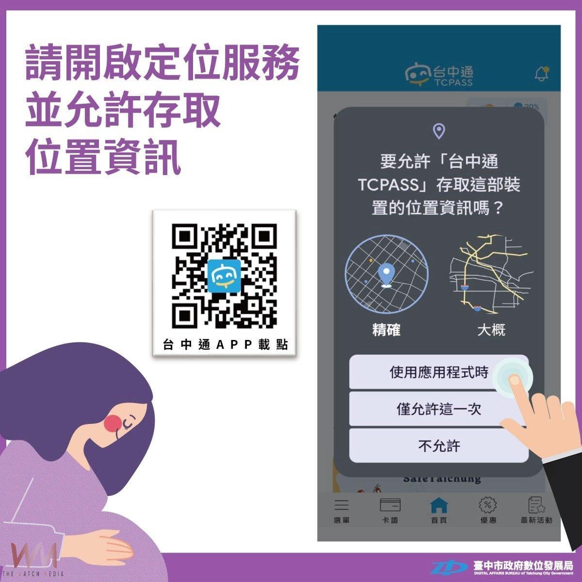 數位局提醒,近期有孕媽咪反映在使用「好孕乘車補助」時,畫面出現「請確認手機已開啟定位服務,並授權APP存取位置資訊」的提醒訊息。數位局說明,好孕專車補助限定中部四縣市(中、彰、投、苗)地區使用,為確認使用者所在地,請孕媽咪務必開啟手機定位服務,並允許APP存取位置資訊,才能順利使用乘車金、安心搭車!