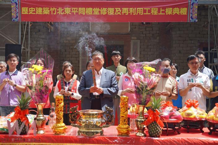 (觀傳媒桃竹苗新聞)【記者金祐妤/新竹報導】新竹縣歷史建築-竹北東平問禮堂,今 (17)日上午舉行修復及再利用工程的上樑典禮,寫著上樑大吉的樑木上,綁著一串粽子、紅布包的米、 燈,並用青布緾繞,寓意包中、五榖豐收、添丁、青龍飛天,縣長楊文科帶領文化局及工程隊、地方民代焚香祝禱,祈求建築主體結構穩固堅實,工程順利圓滿。