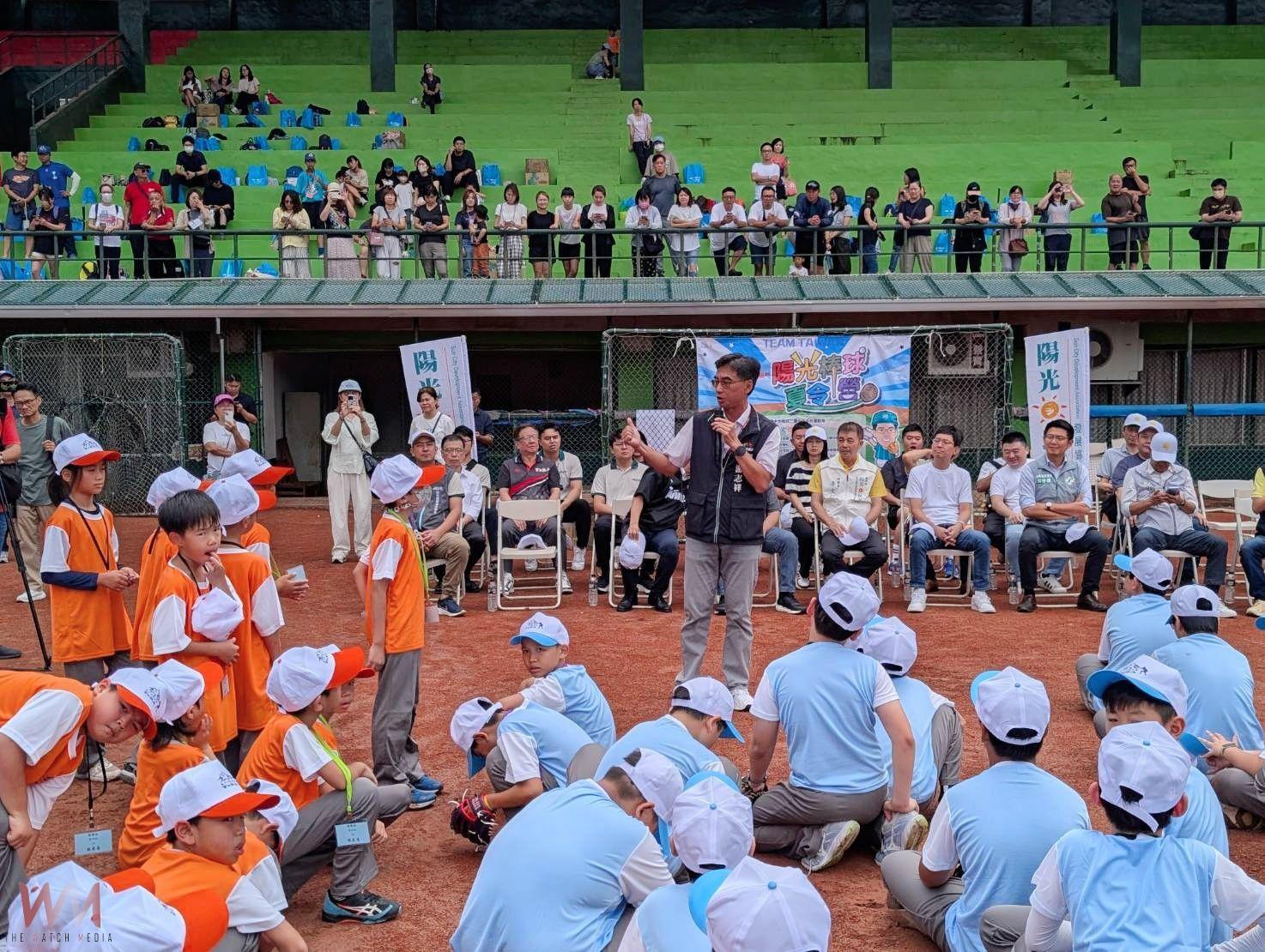 (觀傳媒中彰投新聞)【記者廖妙茜/台中報導】台中近年積極推動棒球運動,培育基層棒球人才,由教育部次長張廖萬堅2004年創辦的陽光棒球夏令營,今(29)日開始一連三天在萬壽棒球場熱鬧開訓,運動局長游志祥到萬壽棒球場參加開幕式,並與台中市陽光城市發展協會理事長李文烈、此次活動神秘嘉賓中華職棒大聯盟會長蔡其昌及中信兄弟好手黃恩賜、伍立辰等人一同開球,為棒球營拉開序幕。