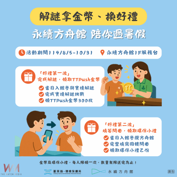 (觀傳媒花東新聞)【記者劉百瑞/台東報導】為深化全民環境教育理念,臺東縣環境保護局永續方舟館今夏推出親子友善的環境教育學習體驗,結合手機辦理無紙化實境解謎活動,打造寓教於樂的綠色學習場域,自8月5日起至10月31日止,凡現場完成解謎任務即可領取TTPush金幣300枚,另填答參訪意見回饋問卷調查,即可獲得環保小禮品乙份。兩項活動限本人現場參與,每人限領一次,金幣總數60,000枚及禮品數量有限,送完為止,歡迎民眾於暑假與假日期間踴躍前往永續方舟館參加。