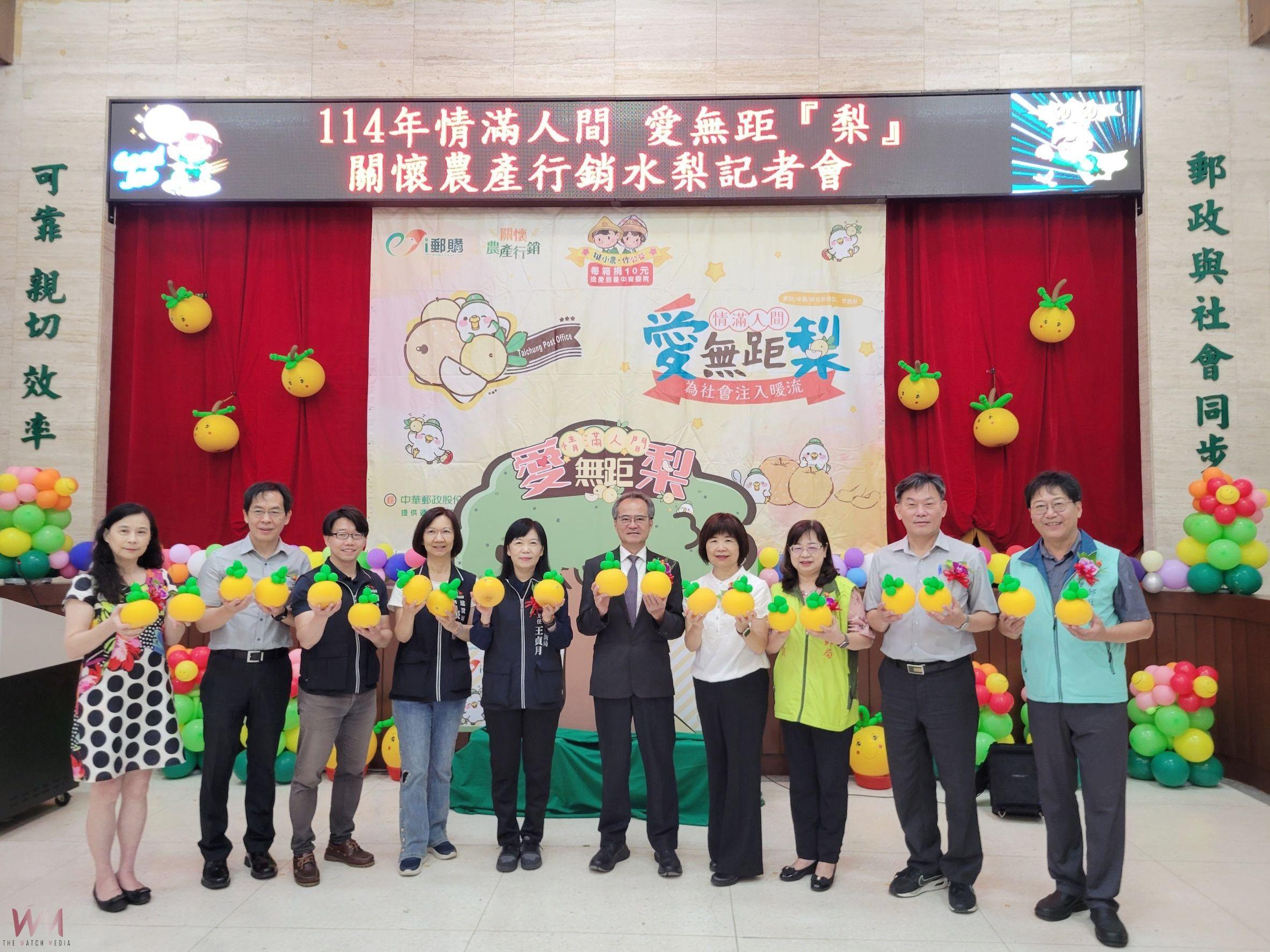 「情滿人間-愛無距『梨』」活動記者會於今(6)日在臺中郵局8樓大禮堂辦理,由臺中郵局局長葉玉瑕、東勢區農會、新社區農會、合作果農代表及公益捐助對象「台中育嬰院」共同為活動揭開序幕,同時邀請臺中市政府社會局、農業局、經濟發展局及各級民意代表等蒞會共襄盛舉。