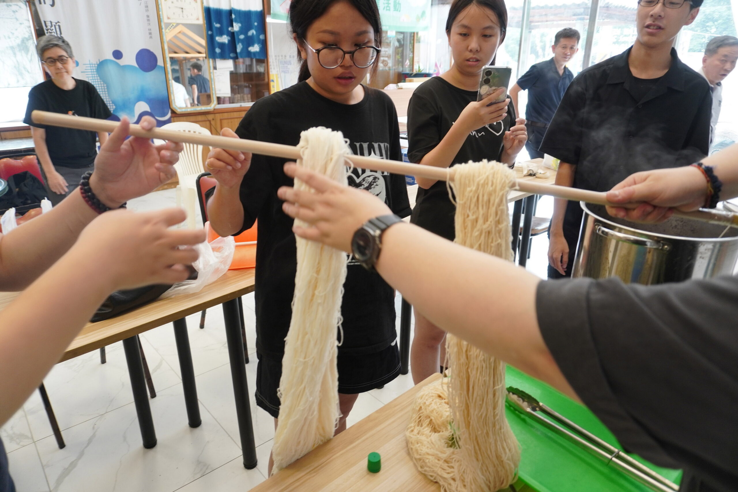 隨後,學生們前往太平藍染工坊,接受創辦人葉晉玉的親自指導,體驗從染料準備到毛線染色的完整流程。從調配染料與水的比例、毛線的前處理,到熬煮染液、媒染劑使用,再到重複染色以增強色彩飽和度,每個步驟都需細心掌控。學生們親手操作,將原本潔白的毛線逐漸染成靛藍、茶褐等自然色彩,藉由實作體驗將理論轉化為具體成果,感受傳統工藝的生命力與魅力。