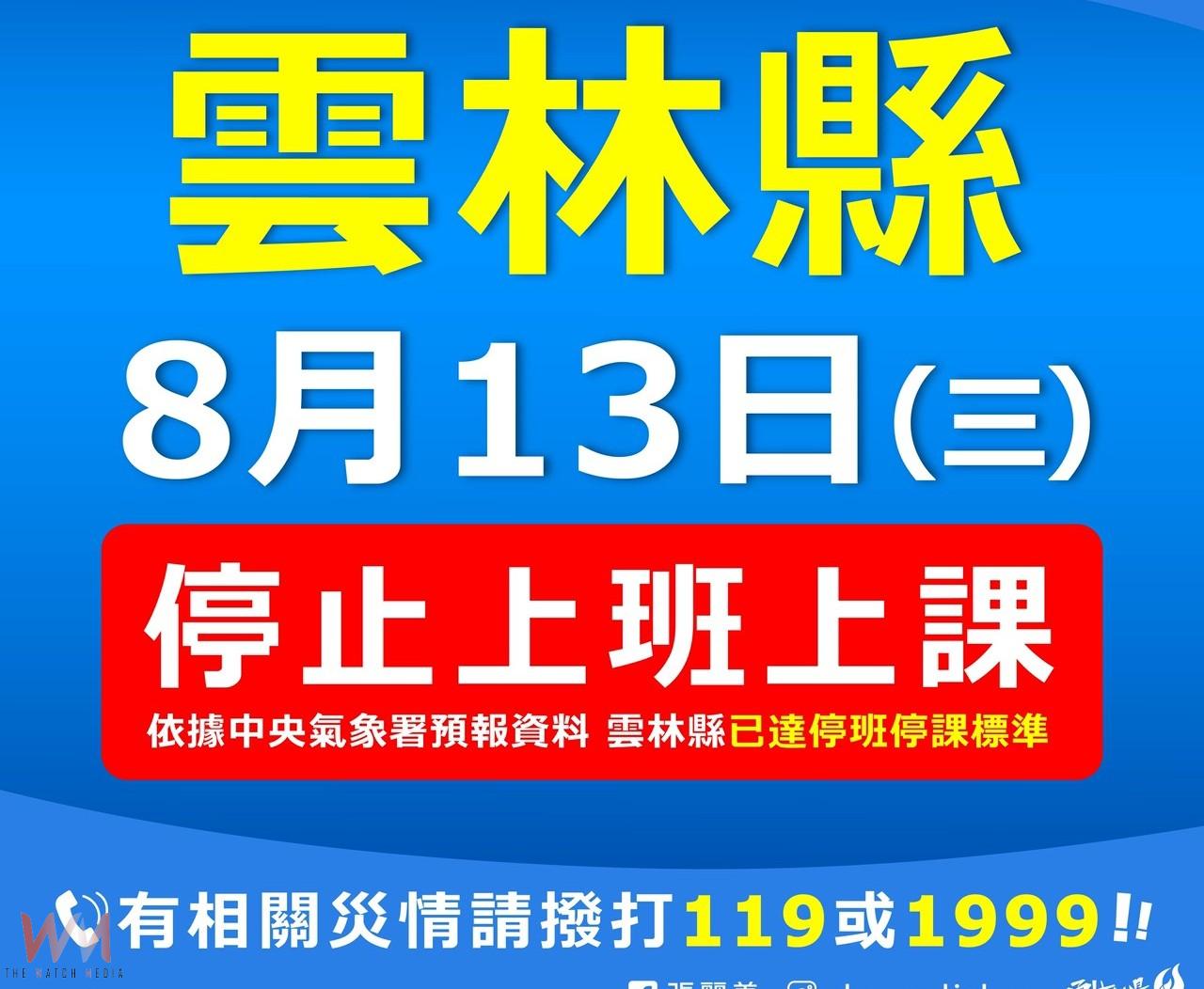 (觀傳媒雲林新聞)【記者蘇榮泉/雲林報導】雲林縣政府今(12)日依據中央氣象署最新颱風楊柳警報資料,評估明(13)日風力預測已達停班停課標準,為確保縣民安全,宣布全縣於8月13日(星期三)停止上班、停止上課。