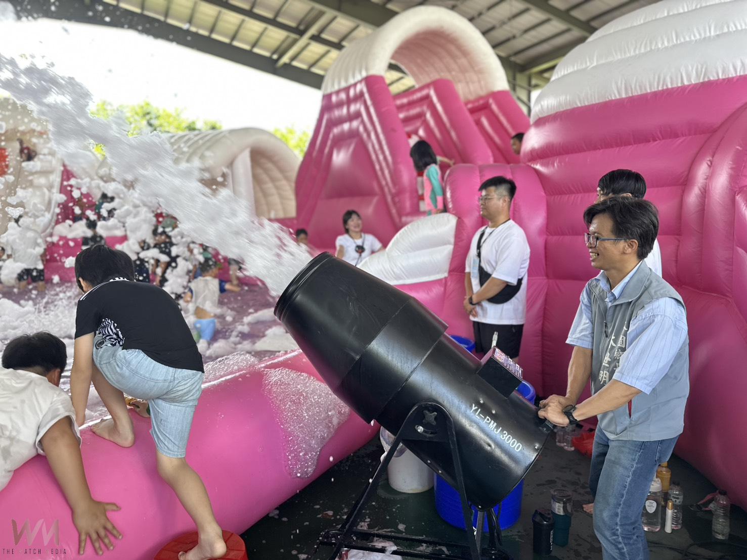 今年活動以「極地冰雪」為主題,鄉公所打造超大型氣墊水池,寬20公尺、長20公尺,孩子們帶著水槍、漂浮圈和心愛玩具,在水池裡追逐嬉戲,尖叫聲、笑聲、泡泡飛濺聲交錯成一片歡樂海洋。鄉長林世明還親自操作泡泡機,噴出雪白泡沫,小朋友立刻衝上前打滾、追逐,直喊「太好玩了!」