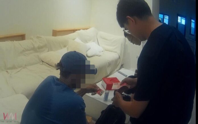 當車手現身準備收款時,警方一舉將其逮捕。車手見到「請喝茶」的人竟是警方,當場愣住,只能乖乖就範。(圖/記者蘇榮泉翻攝)