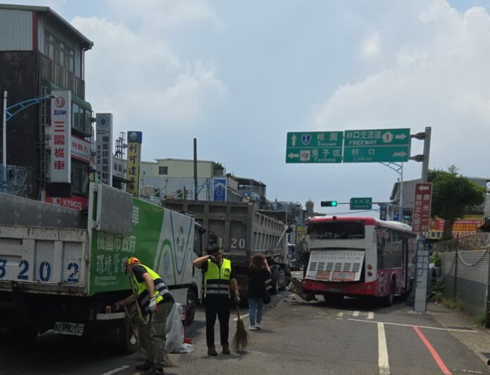 (觀傳媒桃竹苗新聞)【記者曾平/桃園報導】今(18)日11時24分許,桃園市龜山區萬壽路二段與大同路口發生一起涉及大型車輛的連環交通事故。一輛砂石大貨車行經該路段時,疑似未保持安全距離,不慎先撞上正停靠站下客的桃園客運公車,隨後又波及前方曳引車。由於事發突然,公車車體後側受損明顯,車上乘客受到撞擊強烈晃動,紛紛發出驚呼聲,造成六名乘客受傷。警方及消防救護人員接獲報案後,立即派員趕赴現場進行傷患救護與交通管制。
