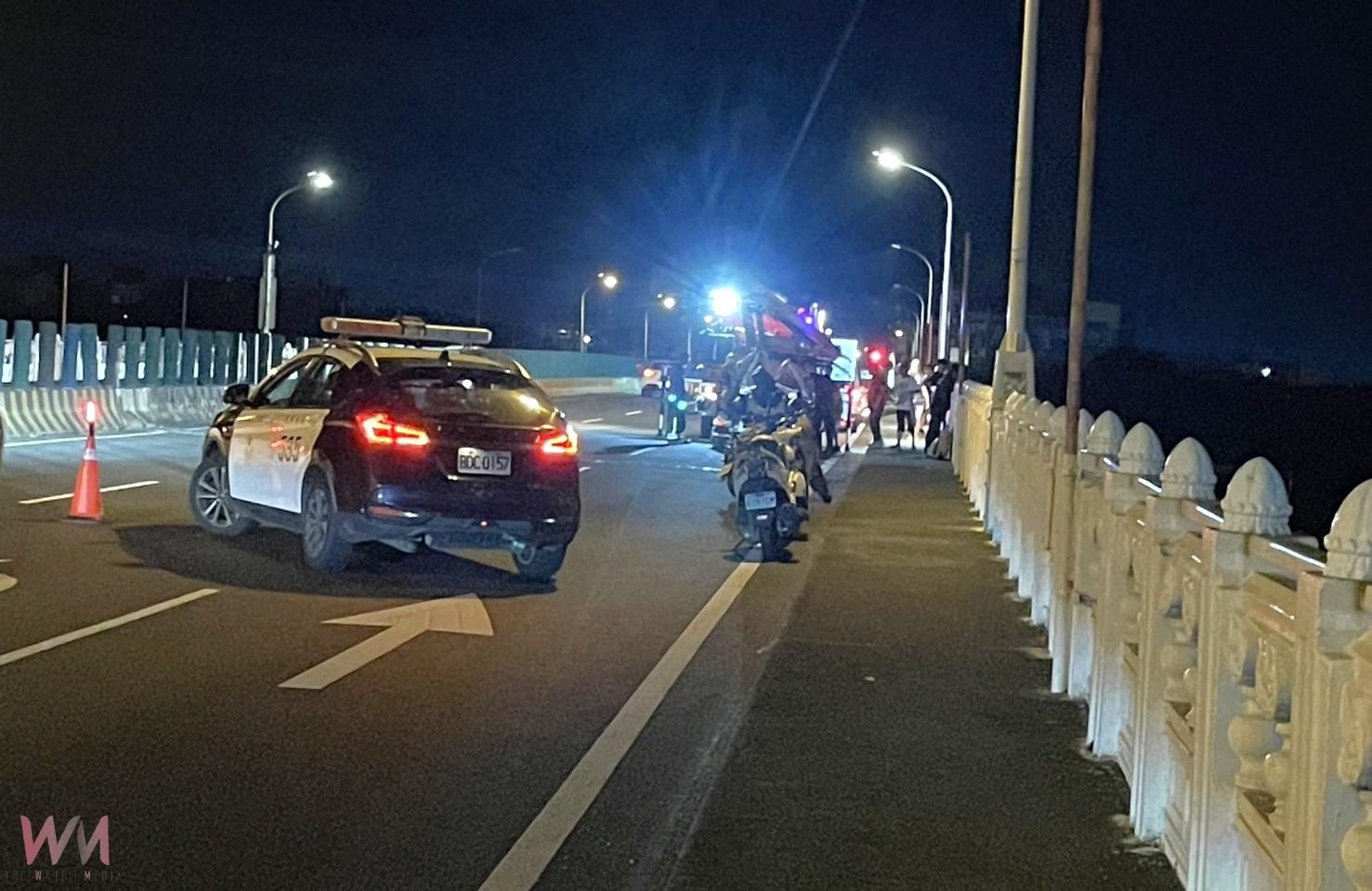 所長許峯豪指出,警方發現一輛小客車未開車燈行駛,該車牌早已註銷,駕駛越南籍失聯移工當場被警方逮捕,一名女子竟從北港大橋一躍而下,墜入北港溪。(圖/記者蘇榮泉翻攝)