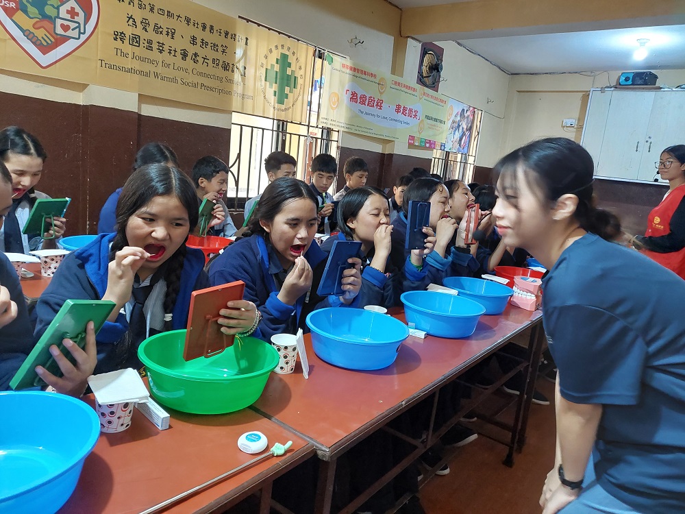 此行服務團隊共有9人,包括:耕莘專校3位師生,及基金會6位成員,其中包含3位護理師。在前譯紀念學校負責人久美喇嘛(Gyurmed Dorjee Lama)的安排下,團隊進行口腔衛教與實作訓練,幫助學生養成一生受用的潔牙習慣。