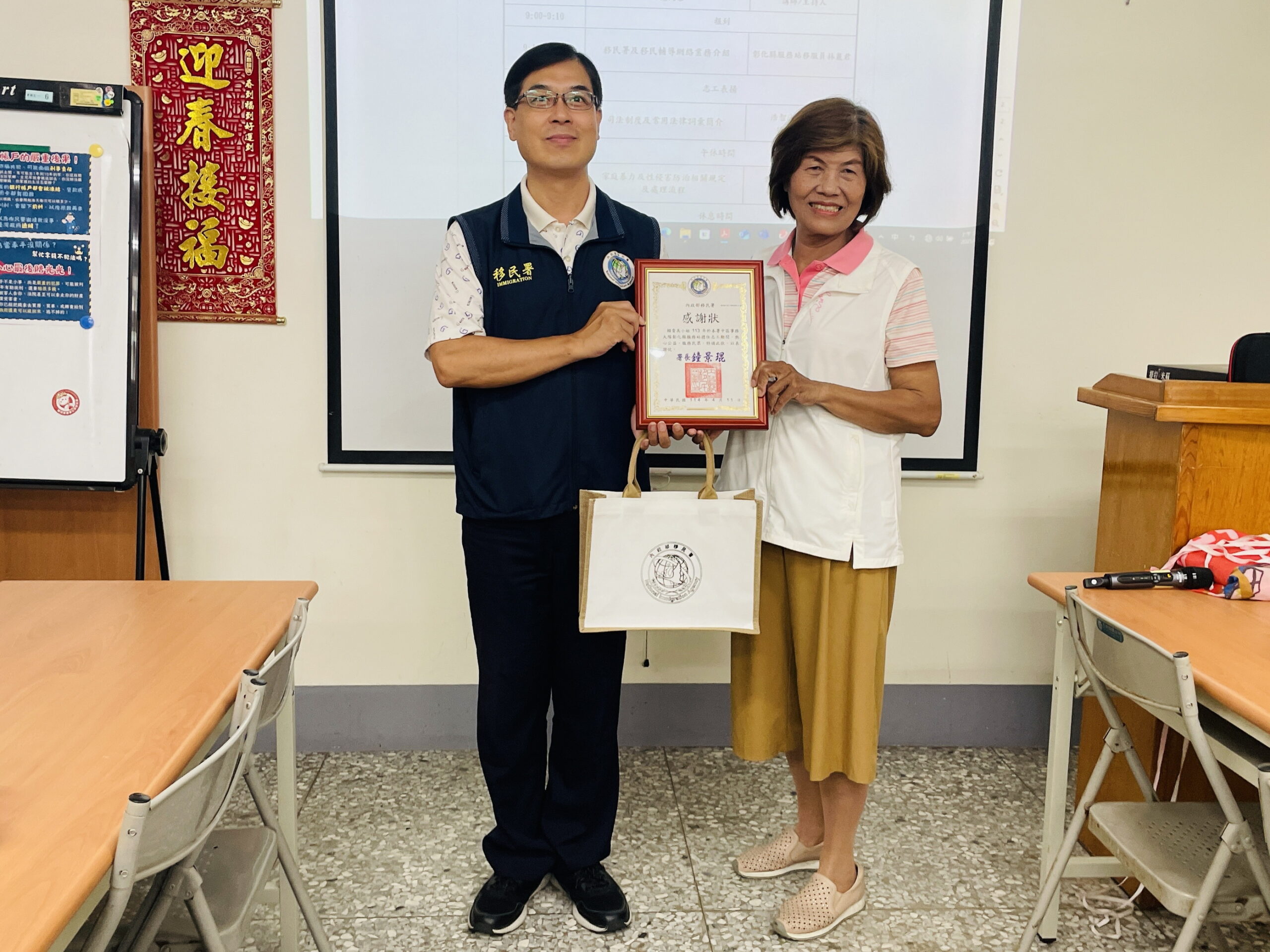 今(21)日在結訓典禮上,服務站特別表揚113年度績優志工賴貴美女士。賴女士自公職退休後,本可安享生活,卻因女兒考上移民特考泰語組而受到啟發,決定投入志工行列,至今已服務7年。