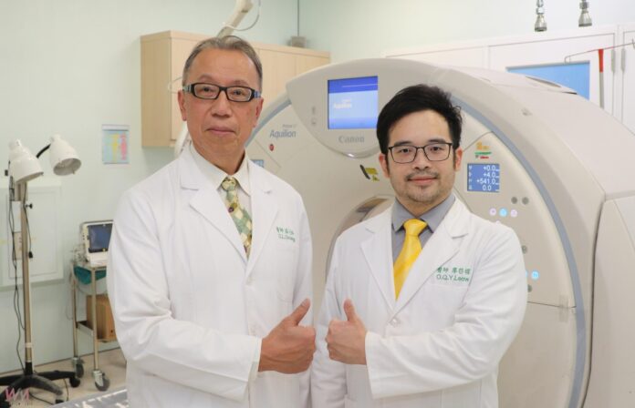 廖啟耀主任(右)和莊芝林主任依(左)影像學檢查研判病人可能罹患胸腺瘤,以達文西機器人手術幫助病人康復。(圖/記者廖妙茜翻攝)