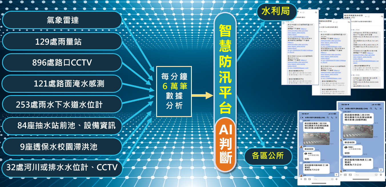 水利局長宋德仁指出,新北市去(113)年底開發6處CCTV雨絲辨識技術,當降雨達到10mm/10min時會自動化AI推播,可比中央氣象署提前16分鐘即時偵測暴雨訊號,預計今(114)年底將再新增6處。此外,目前市轄下有607支具有積淹水影像辨識功能的CCTV,搭配淹水感測器雙重驗證,即時掌握積淹水的範圍與深度,今年預計再增加100支,提升防汛人員判斷及掌握災情的能力。
