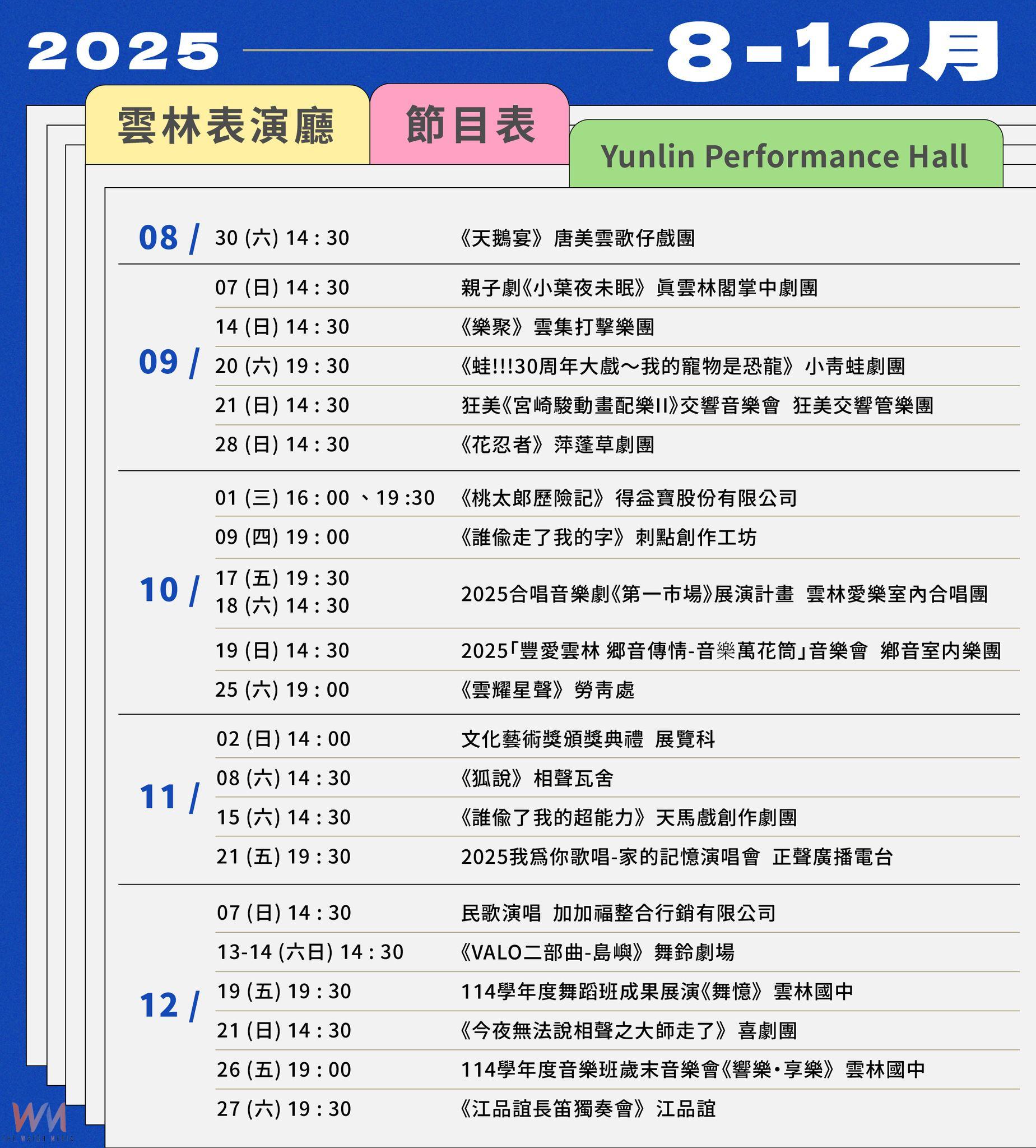 進入秋冬,節目依舊高潮迭起。十一月有相聲瓦舍《狐說》,以幽默機智拉近觀眾與社會議題;十二月則安排民歌經典之夜,邀請鄭怡、于台煙、方季惟、殷正洋及李明德同台,帶來溫暖懷舊的旋律。舞鈴劇場《VALO二部曲-島嶼》也將登場,並由公益信託鈺齊國際慈善公益基金贊助。喜劇團《今夜無法說相聲之大師走了》則以歡笑陪伴大家迎接新年。另有雲林國中舞蹈班《舞憶》、音樂班歲末音樂會《響樂.享樂》,以及青年音樂家江品誼長笛獨奏會,展現新世代藝術能量,與國家級團隊共同織就全年最動人的藝文盛宴。