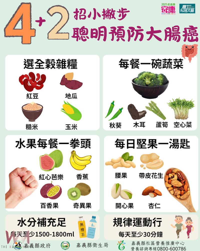 嘉義縣衛生局推4+2招預防大腸癌。(圖/嘉義縣政府提供)