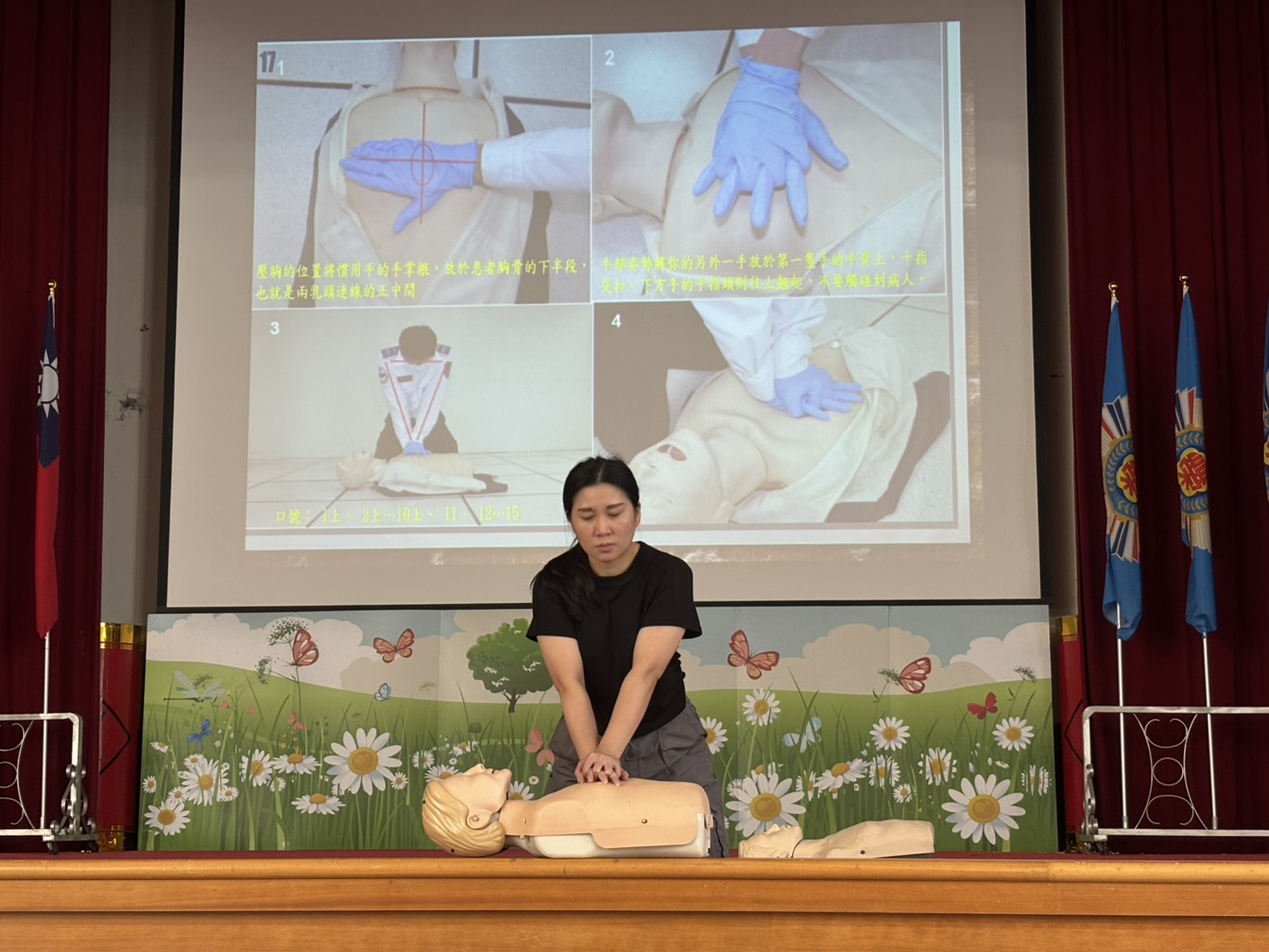 這場訓練邀請到臺中榮總埔里分院副護理長張家熒到場授課。課程一開始,她先以實際案例分享心臟驟停的危險性,提醒大家「黃金四分鐘」的重要性,並透過生動講解,帶領學員一步步熟悉流程。