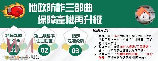 地政局表示,此三法寶分別為第一寶:地籍異動即時通~申辦後,當不動產涉及買賣、抵押權設定等13類登記事項時,系統將於「收件」時即以簡訊或電子郵件通知所有權人或指定聯絡人,讓民眾即時掌握地籍異動,防止不法冒用。
