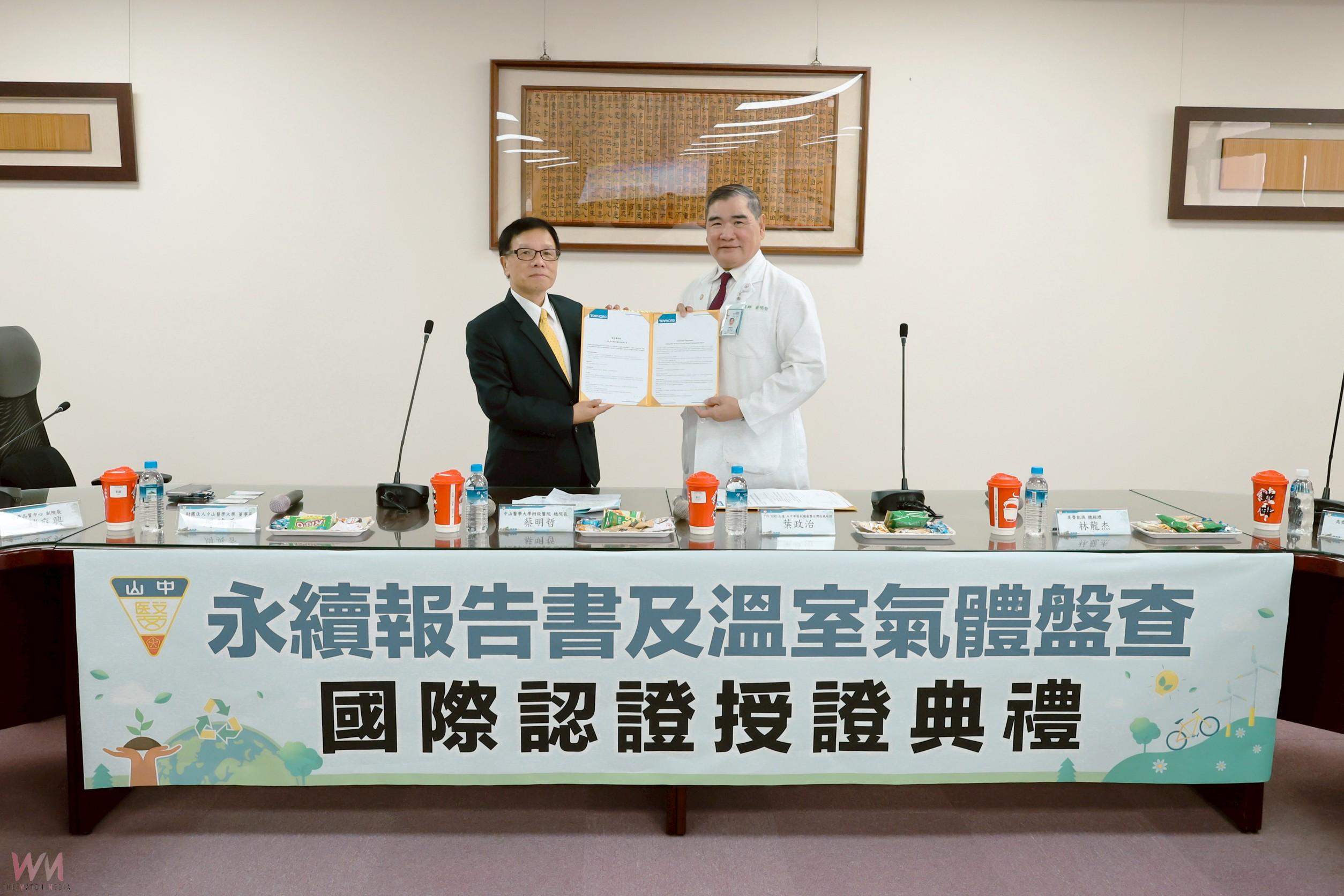 (觀傳媒中彰投新聞)【記者廖妙茜/台中報導】中山醫學大學附設醫院(下稱:中山附醫),於日前舉行授證典禮,正式獲得德國北德公司(TÜV NORD)頒發「永續報告書驗證」及「碳盤查實地訪視」雙重國際認證,展現醫院在永續治理及環境責任上的卓越成果,為台灣醫療院所立下新標竿。