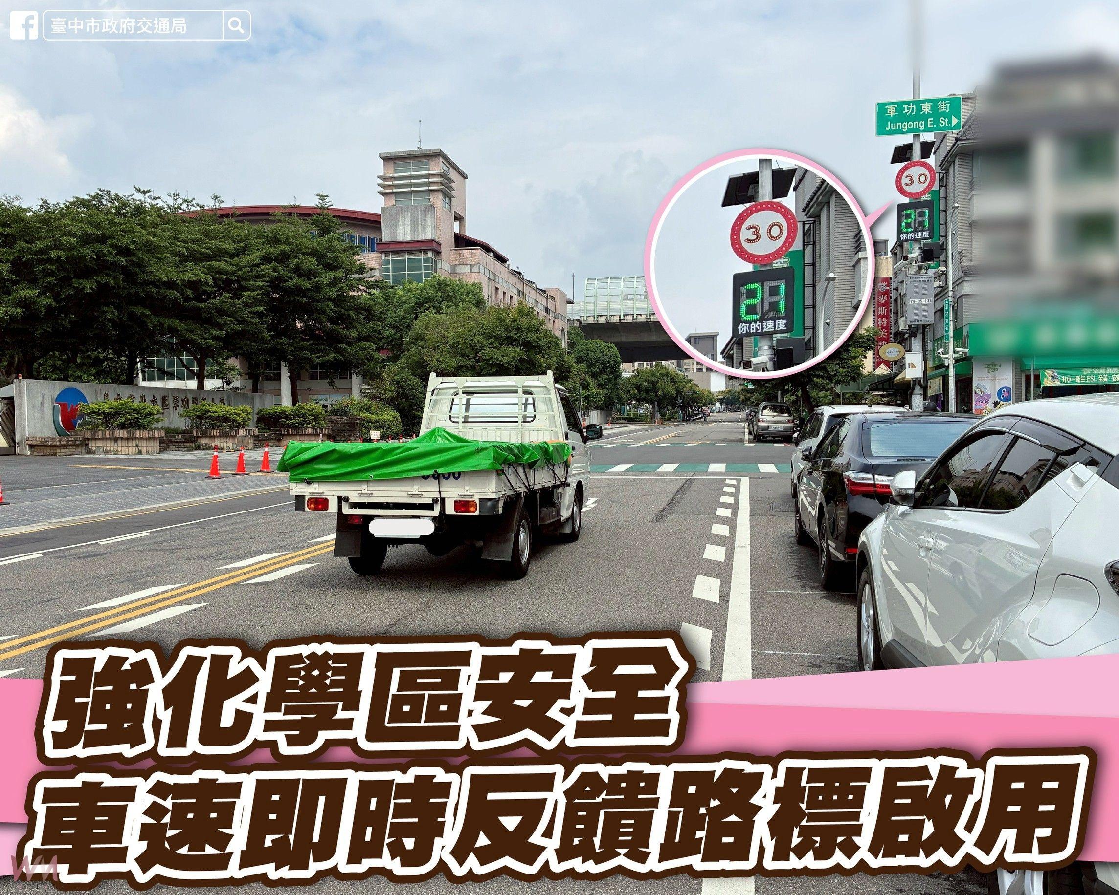 交通局表示,通學區內道路視道路情形調整速限,原則規劃速限30、40公里交通寧靜區,北屯區軍功國小所在路段交通繁忙,透過智慧科技導入,讓駕駛即時意識到行車速度,更能在危險發生前主動預警,啟用首座智慧路標車速警示系統,經評估觀察後,今年預計將配合學校周邊通學環境改善及地方需求的3所學校建置。