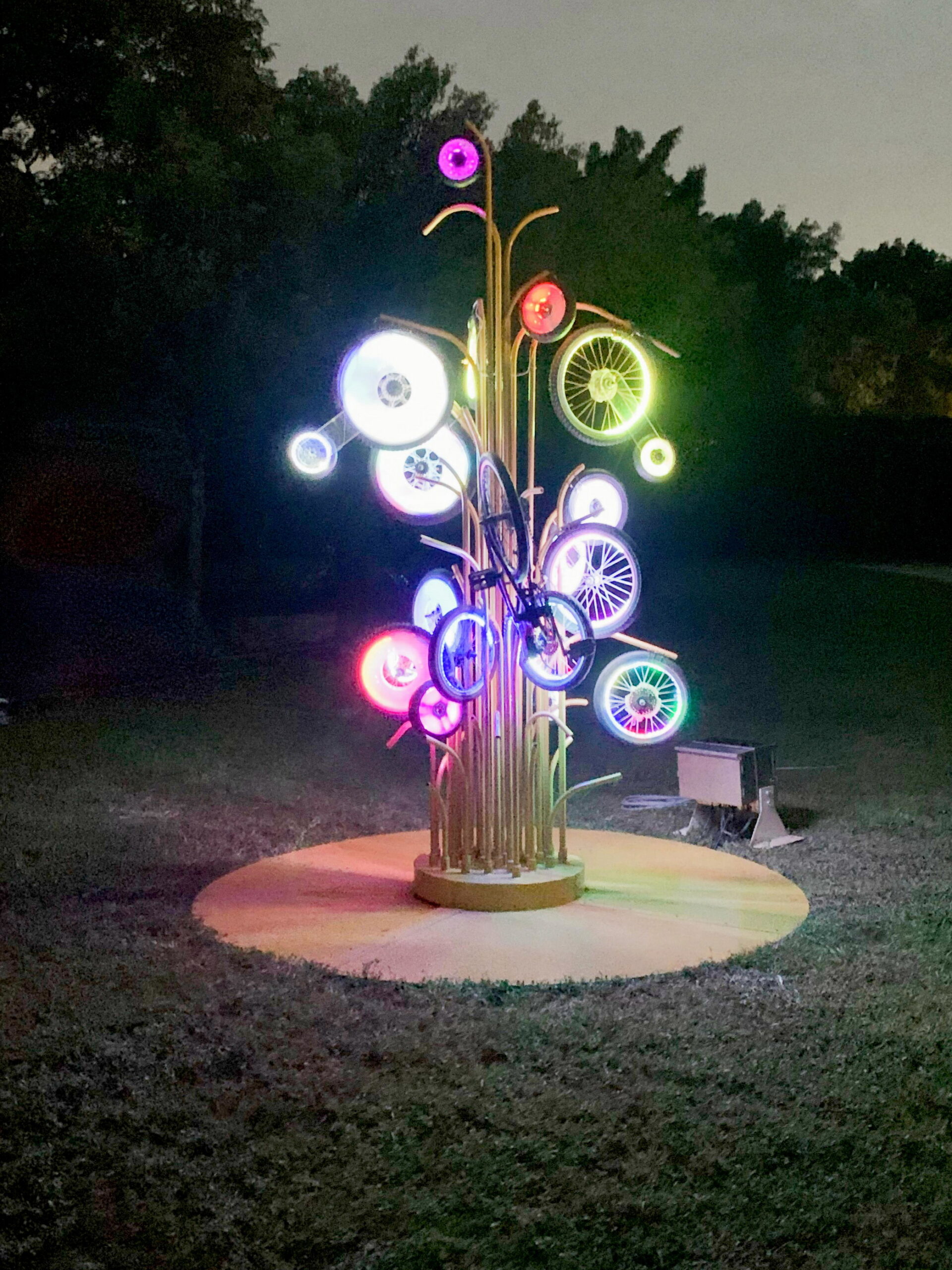賴建源表示,「光之智慧」靈感源自彰化聞名的自行車產業,將自行車輪胎與枝幹結構融合,化身為象徵智慧與創新的「自行車樹」。作品透過車輪、枝幹與燈光的結合,象徵人生旅途中的道路選擇與啟蒙光芒,也傳遞知識、創新與永續理念。整體造型兼具自然與工業美感,呼應大葉大學在「綠色設計」、「永續創新」上的教育核心精神。