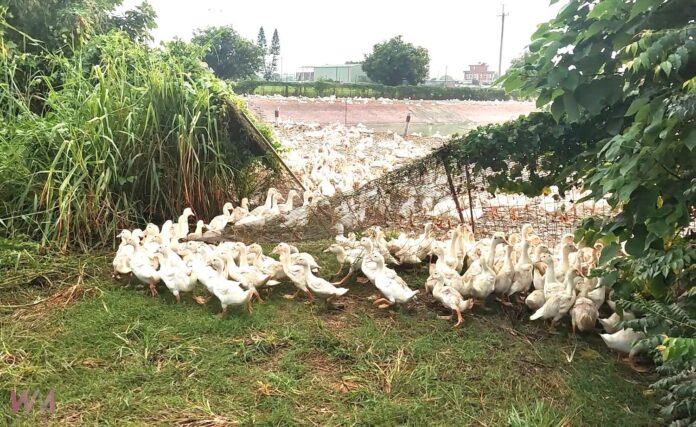 防汛道路旁的養鴨場圍籬因午後強降雨泥土鬆軟倒塌,鴨群趁機全體「大逃亡」,在道路上閒晃。(圖/記者蘇榮泉翻攝)