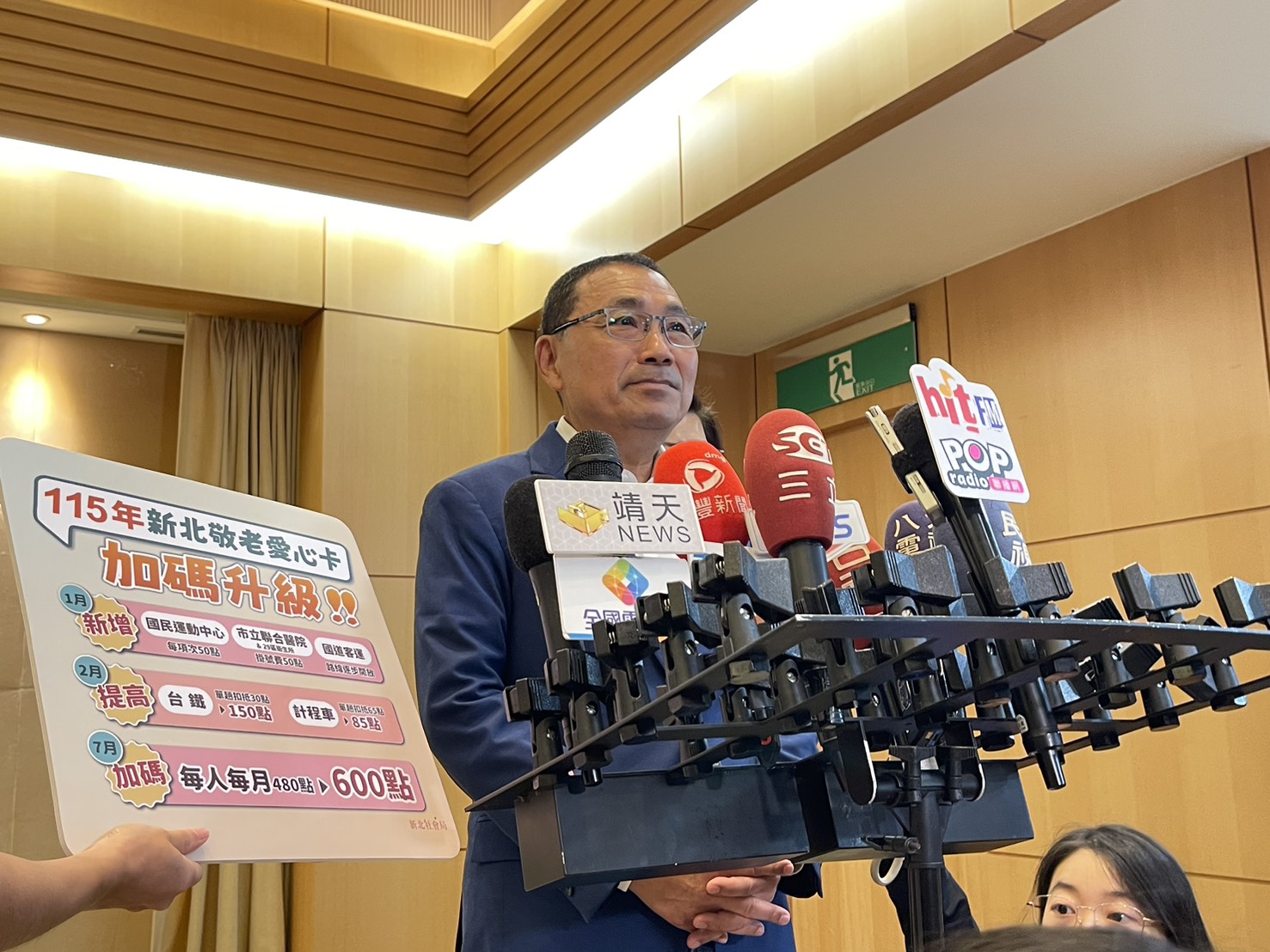 侯友宜表示,為讓長輩活躍老化,擴大社會參與,115年起將陸續新增、提高和加碼敬老愛心卡的使用。包含1月起除原有公車、捷運外,可搭乘國道客運(起訖均在北北基桃宜)、可使用國民運動中心(每項次50點),以及市立聯合醫院與29區衛生所掛號費50點;2月起提高台鐵單趟30點至150點(起訖站開放北北基桃宜)、計程車單趟從65點提高至85點。7月起,則將敬老愛心卡從原來480點加碼至600點,預計超過89萬的長輩及身心障礙者能受惠。