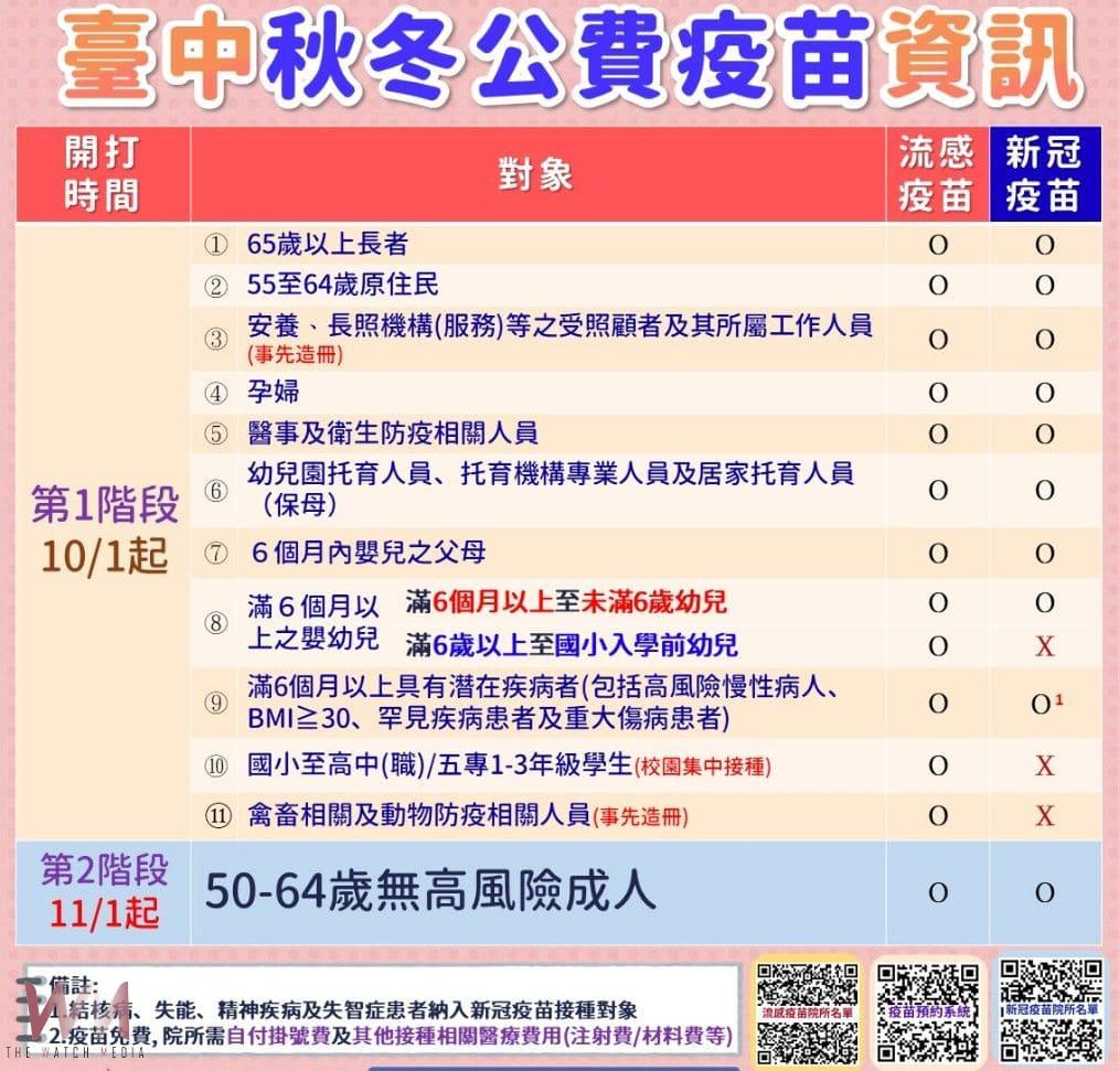 曾局長進一步說明,公費疫苗將分兩階段提供。第一階段自10月1日起,流感疫苗接種對象包括65歲以上長者、學齡前幼兒、醫事與防疫人員、國小至高中職學生、禽畜業者等11類族群;新冠疫苗則涵蓋65歲以上長者、滿6個月至未滿6歲幼兒,以及醫事與防疫人員等九類族群。第二階段將於11月1日啟動,擴及50至64歲、無高風險慢性病的成人,讓更多市民能一次獲得雙重保護。