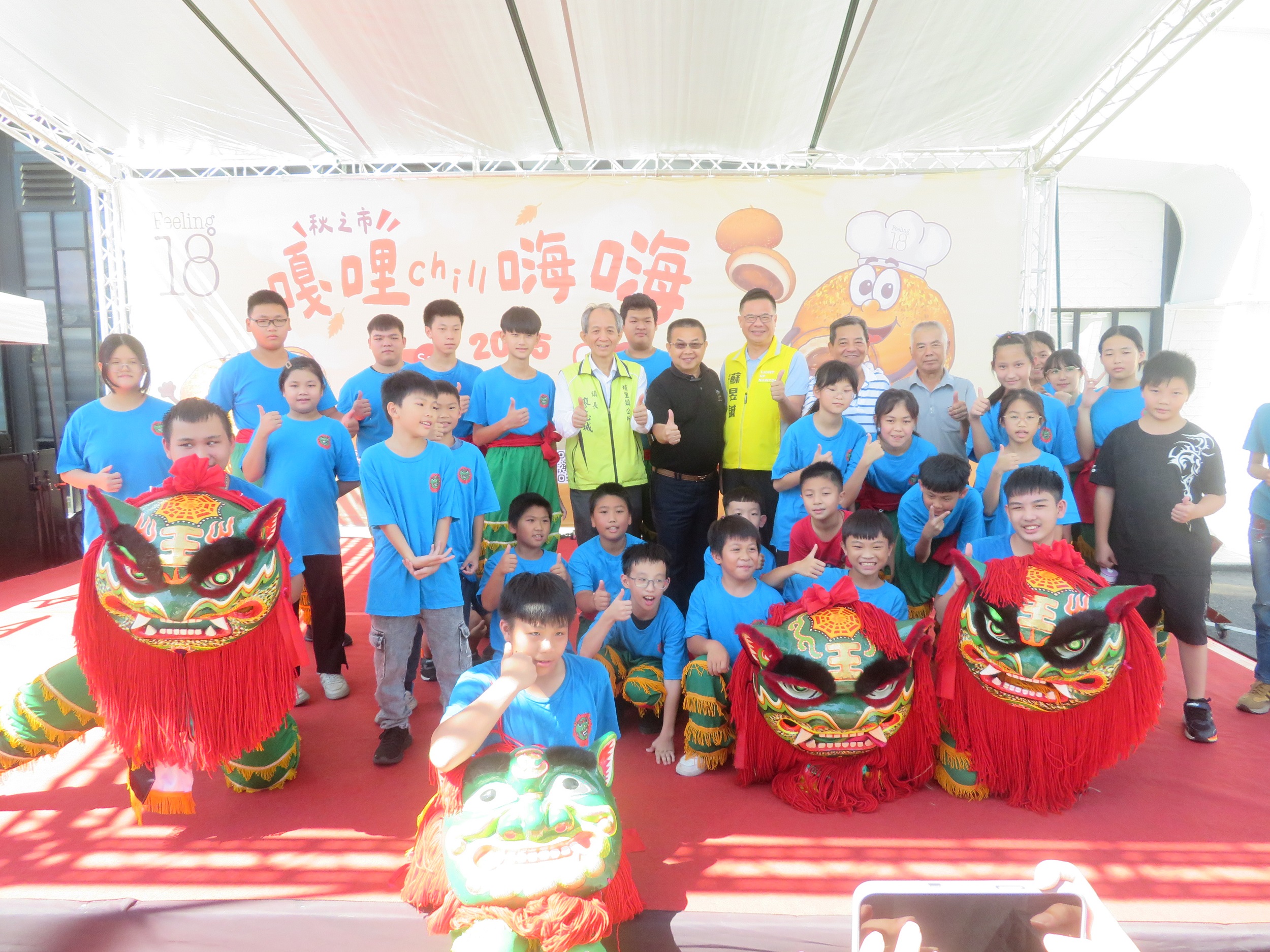 茆師傅及埔里鎮廖鎮長等犒賞舞獅的南投家扶中心同學。(圖/記者石振賢攝)