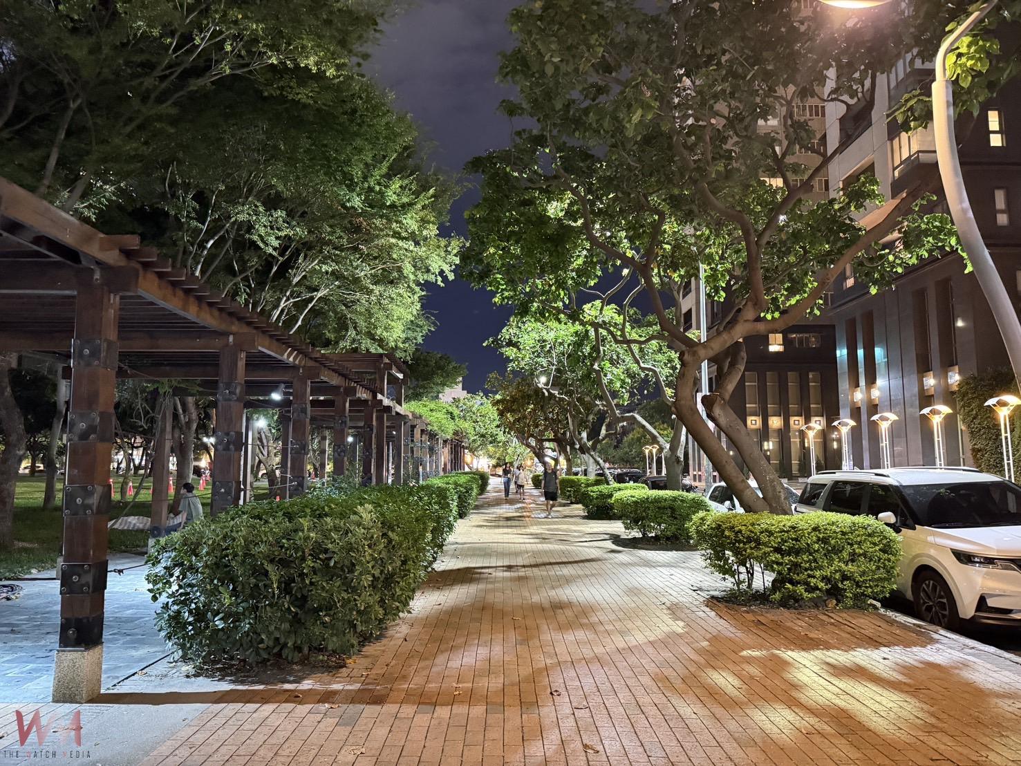 建設局表示,景觀層面,市府特別於臨公益路側調整樹穴,並補植台灣原生櫸木,搭配草皮綠化,營造更舒適的遮蔭環境與生態價值,同時新增及提升周邊燈光數量及照度達53盞,白天綠意盎然、夜晚光影柔美,展現耳目一新的城市風貌。
