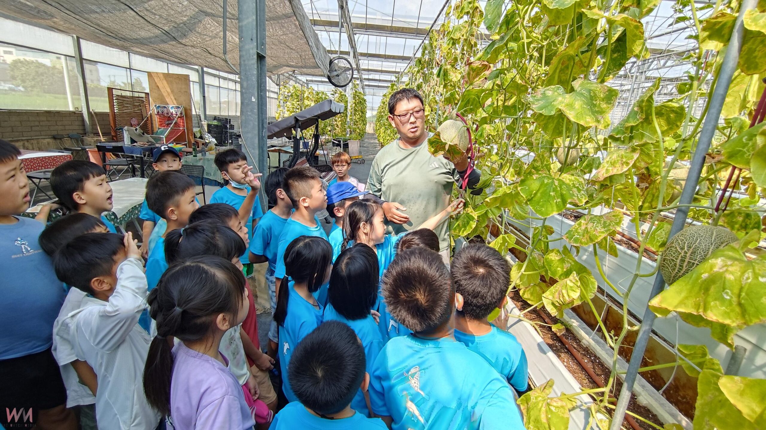 除了採瓜,洪浩軒還帶著孩子們觀察瓜田生態,講解昆蟲與植物共生的關係,以及農作物成長需要的水分、陽光與土壤養分。孩子們好奇地問:「香瓜會痛嗎?怎麼長得這麼快?」洪浩軒耐心解釋,讓孩子們理解農業知識與自然規律。