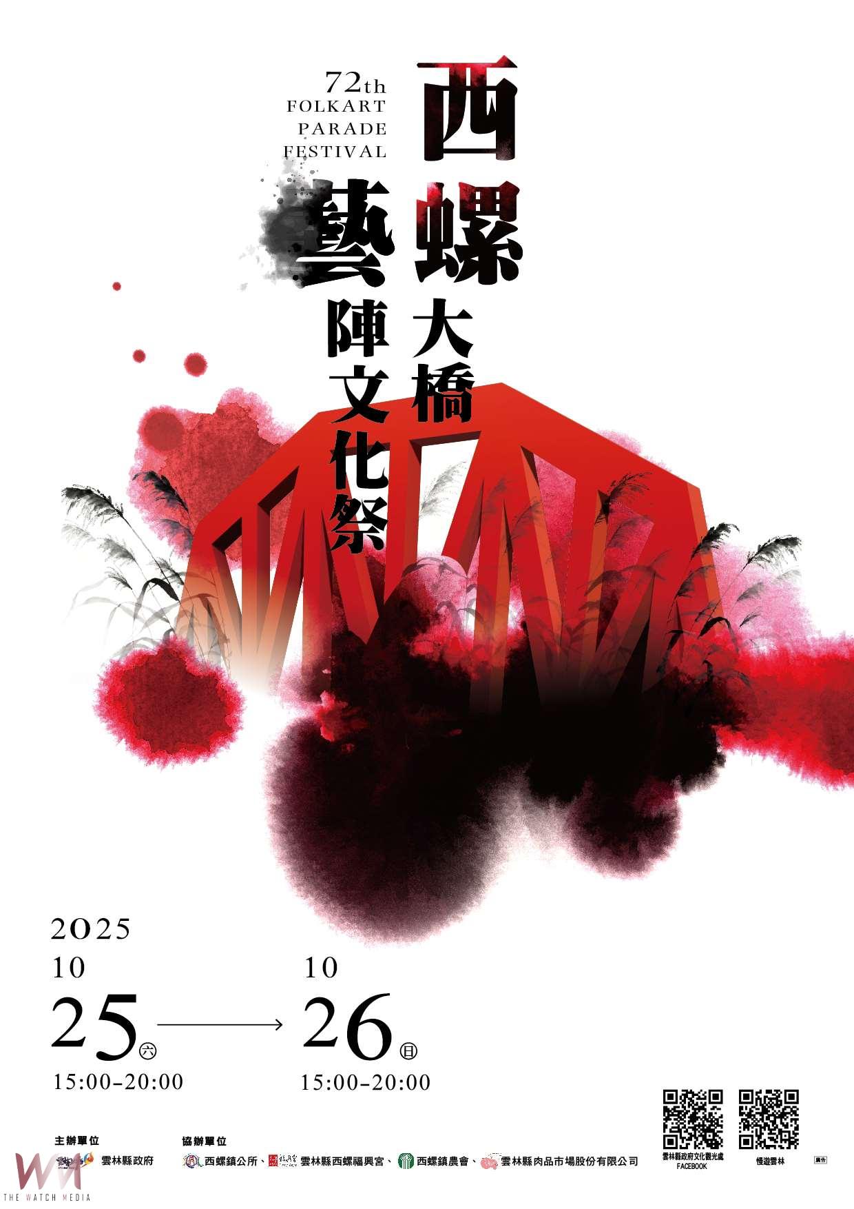 今年西螺藝陣文化祭將再度帶來新的面貌,主視覺設計以「文化傳承」為核心精神,設計靈感源自今年特別規劃的百人書法揮毫活動,將書法的墨韻、濁水溪畔的甜根子草以及西螺大橋的經典紅色相互融合,打造出一幅兼具傳統與時代感的視覺畫面,濃厚的墨色不僅象徵文字與文化的厚實力量,更顯現出人們對地方信仰與生活的深厚情感。