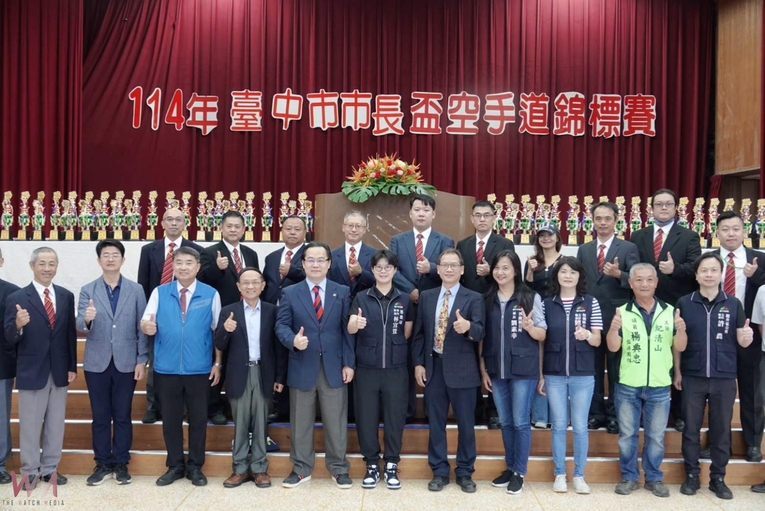 「114年度台中市市長盃空手道錦標賽」開幕式貴賓合影。(圖/記者廖妙茜翻攝)