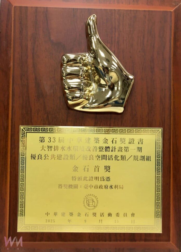 (觀傳媒中彰投新聞)【記者廖妙茜/台中報導】「中華建築金石獎」以台灣品牌自許,長期以來秉持綠色永續經營理念,打造優質人性化的居住環境。台中市水利局今年以「大智排水水環境改善整體計畫第一期」脫穎而出,榮獲第33屆中華建築優良公共工程/優良空間活化類-規劃組「金石首獎」殊榮。此計畫同時也獲得「2024第十二屆台灣景觀大獎」環境規劃類優質獎及「2025國家卓越建設獎」最佳規劃設計類-優質獎,充分展現水利局在水環境營造上的精進與累積成果。